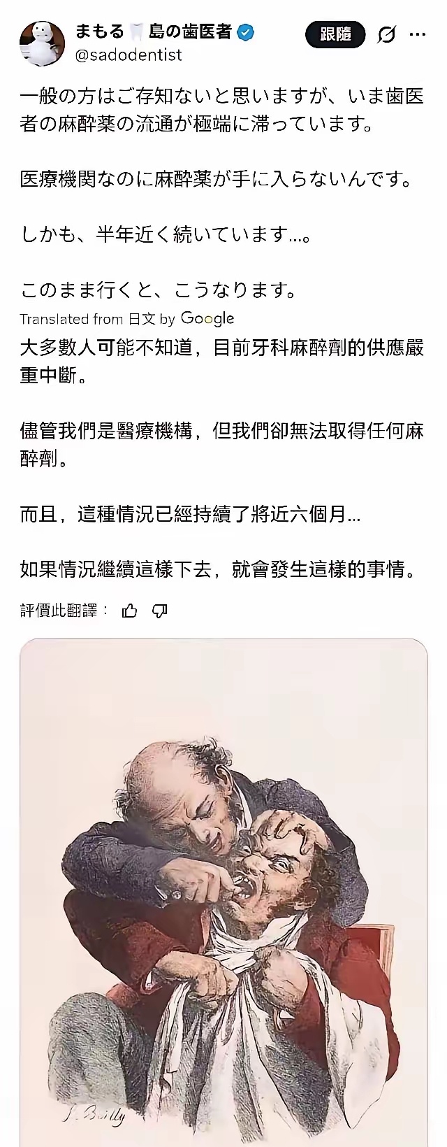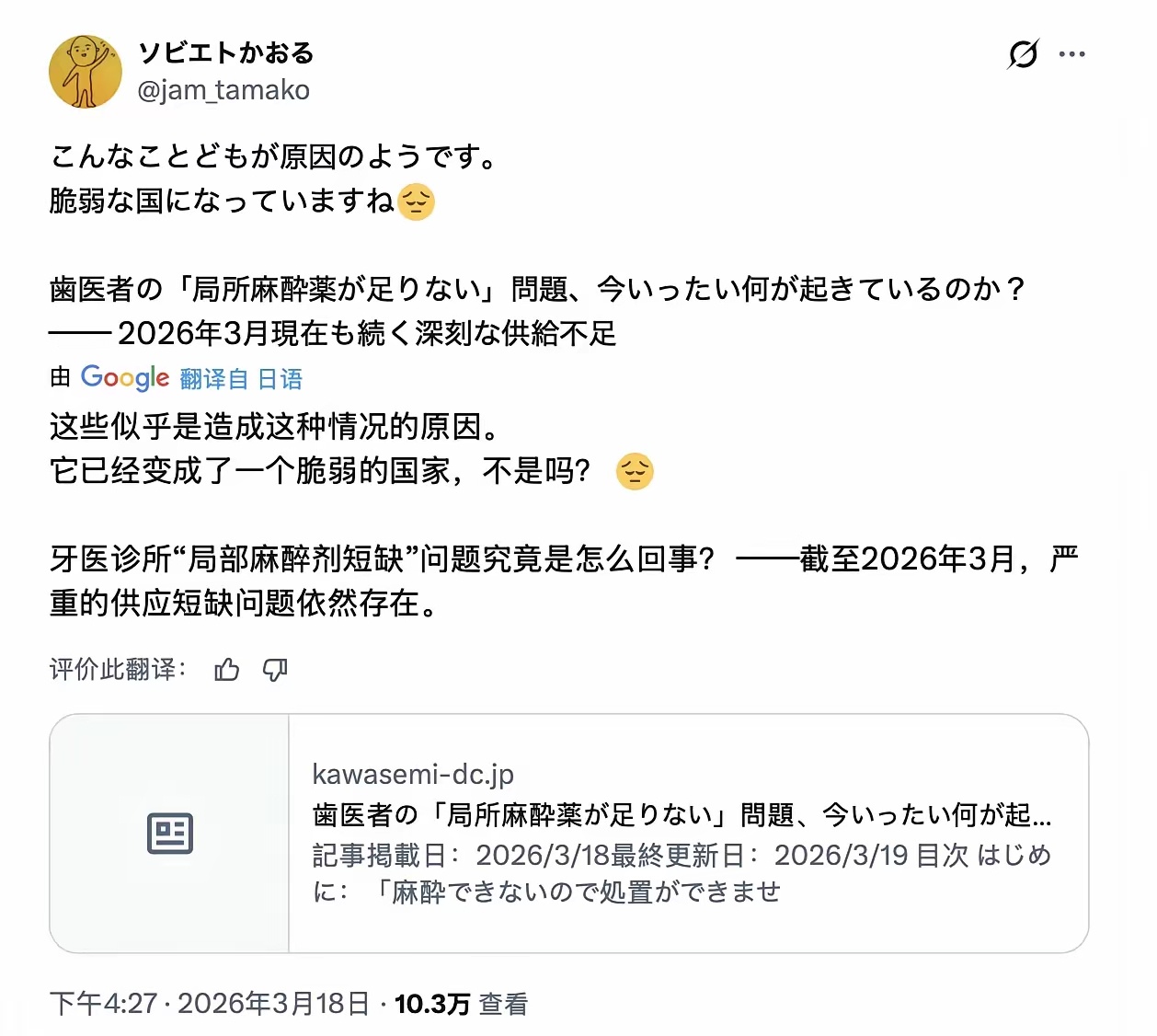 日本麻醉剂危机最近社交平台上出现了很多日本牙医的吐槽,因为拿不到麻醉药,日本牙科诊所贴出公告:因全国性牙科用麻醉药供应不稳定,本院麻醉药采购困难将调整治疗内容,延期使用局部麻醉的治疗、优先处理疼痛少的部位。简单来说就是能不打麻药就不打,能少打就少打,不少患者甚至要面临无麻拔牙。
