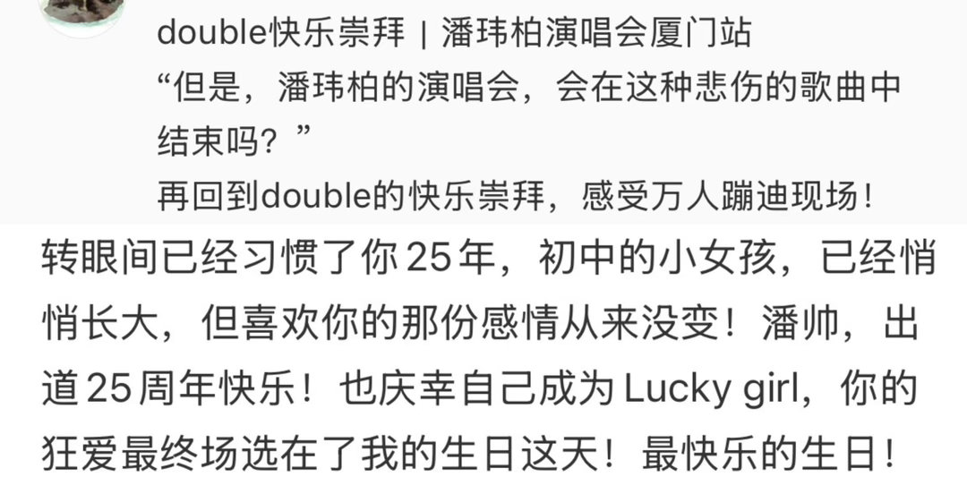 潘玮柏青春有你潘玮柏从2G唱到5G时间是最好的验证!出道25年,潘玮柏用歌声陪我们走过了学生时代到现在。厦门站现场太燃了,全场齐声跟唱,他眼里的泪光,是属于两代人的默契与感动。出道25年,他还在唱,我们还在听,真好!