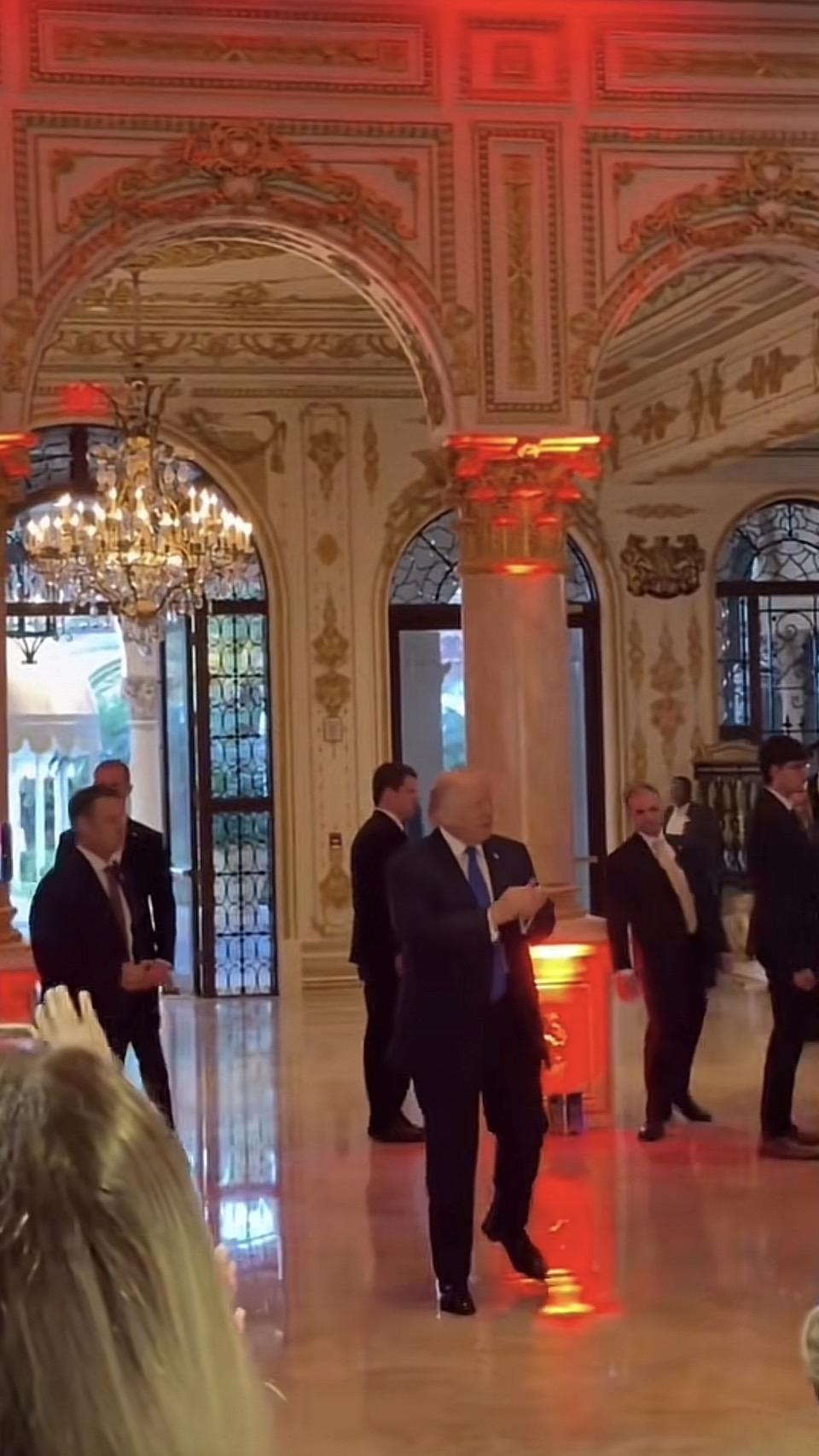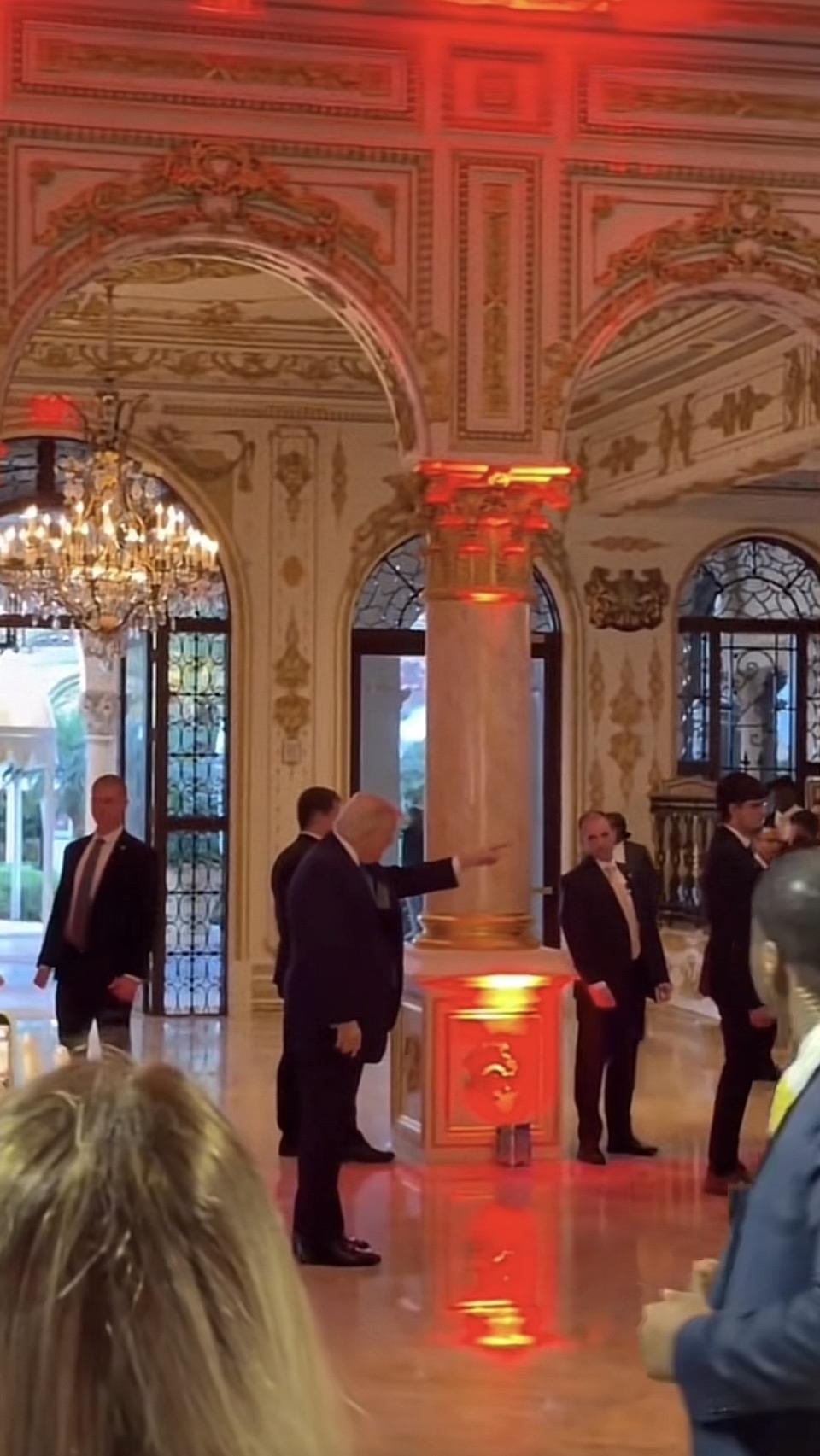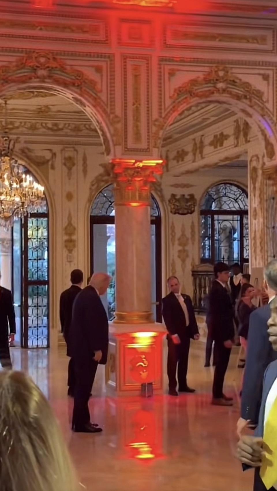 一群西装革履的人在豪华大厅里交谈。