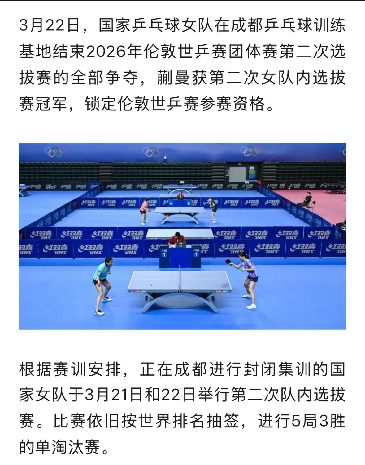 恭喜蒯曼获得伦敦世乒赛第二次队内选拔赛冠军🏆——锁定伦敦世乒赛参赛资格! 重庆冠军赛,蒯曼夺得亚军, 就看出蒯曼涨球了, 3月22日,正在成都封闭训练的 国乒女队进行了第二次队内选拔, 蒯曼在一次突破自己, 分别击败了覃予宣,石洵瑶和 王艺迪夺得队内冠军🏆, 这个伦敦世乒赛参赛名额实至名归! 蒯曼终于赢了石洵瑶, 好难得哦,而且还是3:1赢的, 不容易! 国乒男队还有一个机动名额, 还要看世界杯的成绩! 女队还有第三次队内选拔, 陈熠,王艺迪加油!