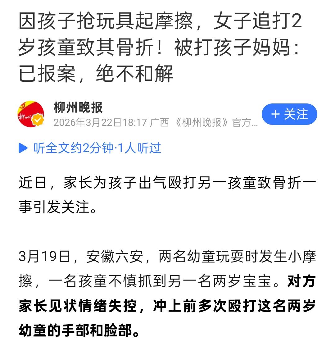 2岁娃被扇到骨折,对方妈妈竟是为娃出气?这次,绝不和解! 太让人气愤了!真的,当了妈之后看不得这种新闻,肺都要气炸了! 这两天,安徽六安发生的一件事,直接冲上了热搜。 两个孩子一起玩,为了个玩具小车有点小摩擦,一个2岁的宝宝可能下意识伸手护了下车。 这本来多大点事儿啊?可谁能想到,另一个孩子的妈妈竟然直接“暴走”了! 她冲上去,对着这个才2岁的娃,又打手又扇脸,追着打!下手那个狠劲,直接把孩子打得右手指骨折,耳膜出血,浑身是伤 。 视频里那孩子撕心裂肺的哭声,听着都让人心碎。这哪里是“护犊子”,这分明就是 “恃强凌弱”! 一个成年人,把生活里所有的戾气,发泄在一个毫无还手之力的幼儿身上,真的太坏了 。 这位打人的妈妈,可能觉得自己是在“保护”孩子。但我想问,你保护了什么?你给孩子上了最糟糕的一课,“只要不爽,就可以动手,哪怕错的是我们”。 以后她的孩子会怎么想?会不会也觉得暴力是解决问题的唯一途径?这种“爱”,真的会毁了孩子的三观。 再说说被打孩子的妈妈。看着自己保胎十个月才生下的宝贝,被人打成这样,心都在滴血。这位妈妈的做法,得到了全网点赞:绝不和解,必须报警处理!。 就得这样!凭什么要和解?如果这次因为对方求情就原谅了,那这种暴力的代价也太低了。 这不仅是为自己的孩子讨公道,更是给所有管不住自己情绪的家长敲响警钟:成年人,必须为自己的冲动买单! 最高法前几天刚发布了保护未成年人的工作指引,强调要“最有利于未成年人”原则 。 在这种高压态势下,还敢对幼儿下此狠手,那就必须让她知道,法律不是吃素的!哪怕是骨折,一旦构成轻伤,那就是妥妥的故意伤害罪,要负刑事责任的 。 真心希望那个被打的宝宝能早日康复,身体和心里的伤都能被抚平。 各位家长,咱们带孩子出门,遇到矛盾真的别急。孩子间的摩擦,大人一旦介入暴力,性质就全变了。你的冷静,才是给孩子最好的保护伞。 对此,你怎么看?如果你是那个被打孩子的家长,你会选择原谅吗?欢迎在评论区留言讨论!