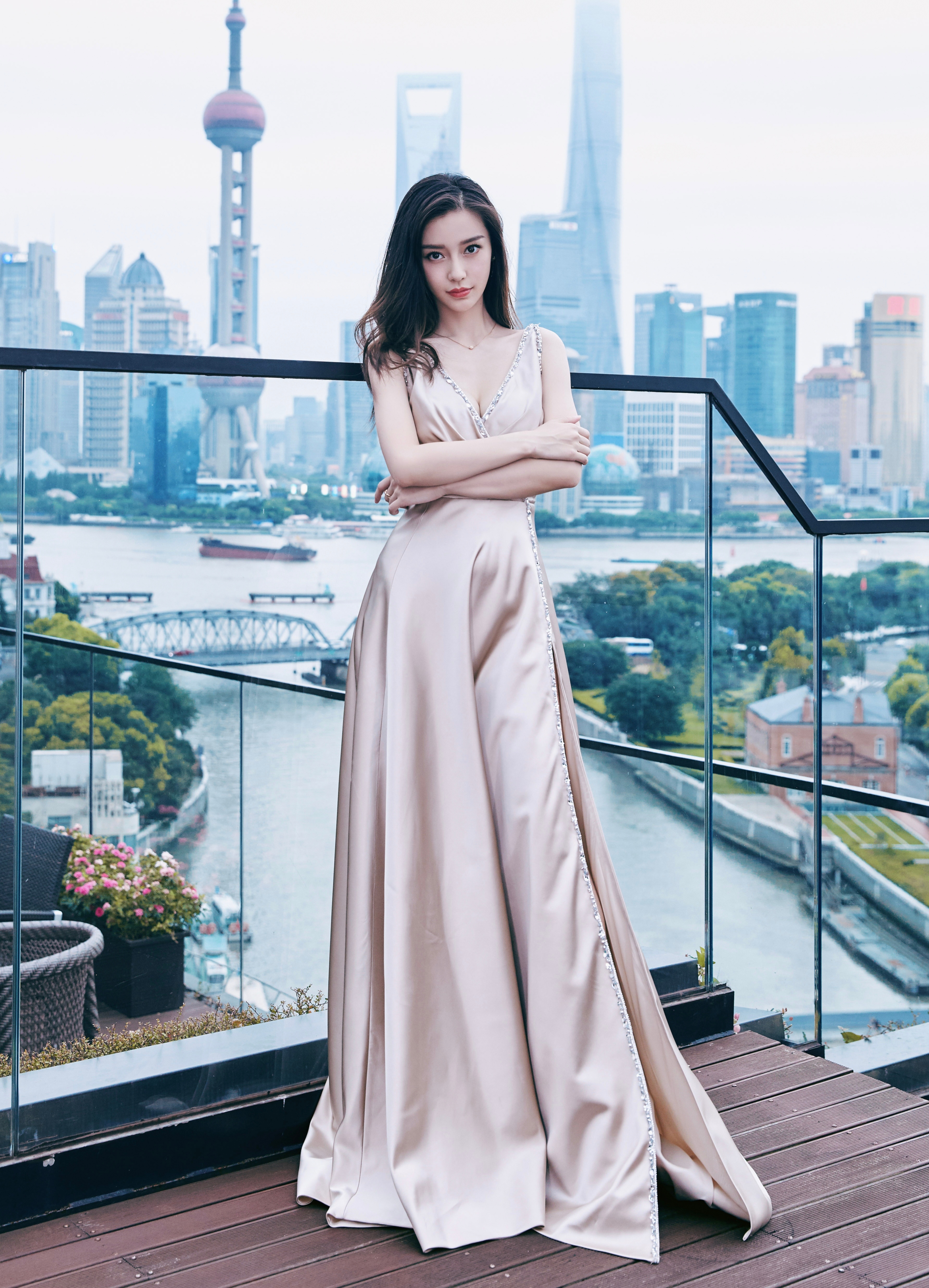 Angelababy 深V吊带+收腰大摆,既勾勒出纤细肩颈线条,又用高腰线+拖尾裙摆拉长比例,显得高挑又挺拔。