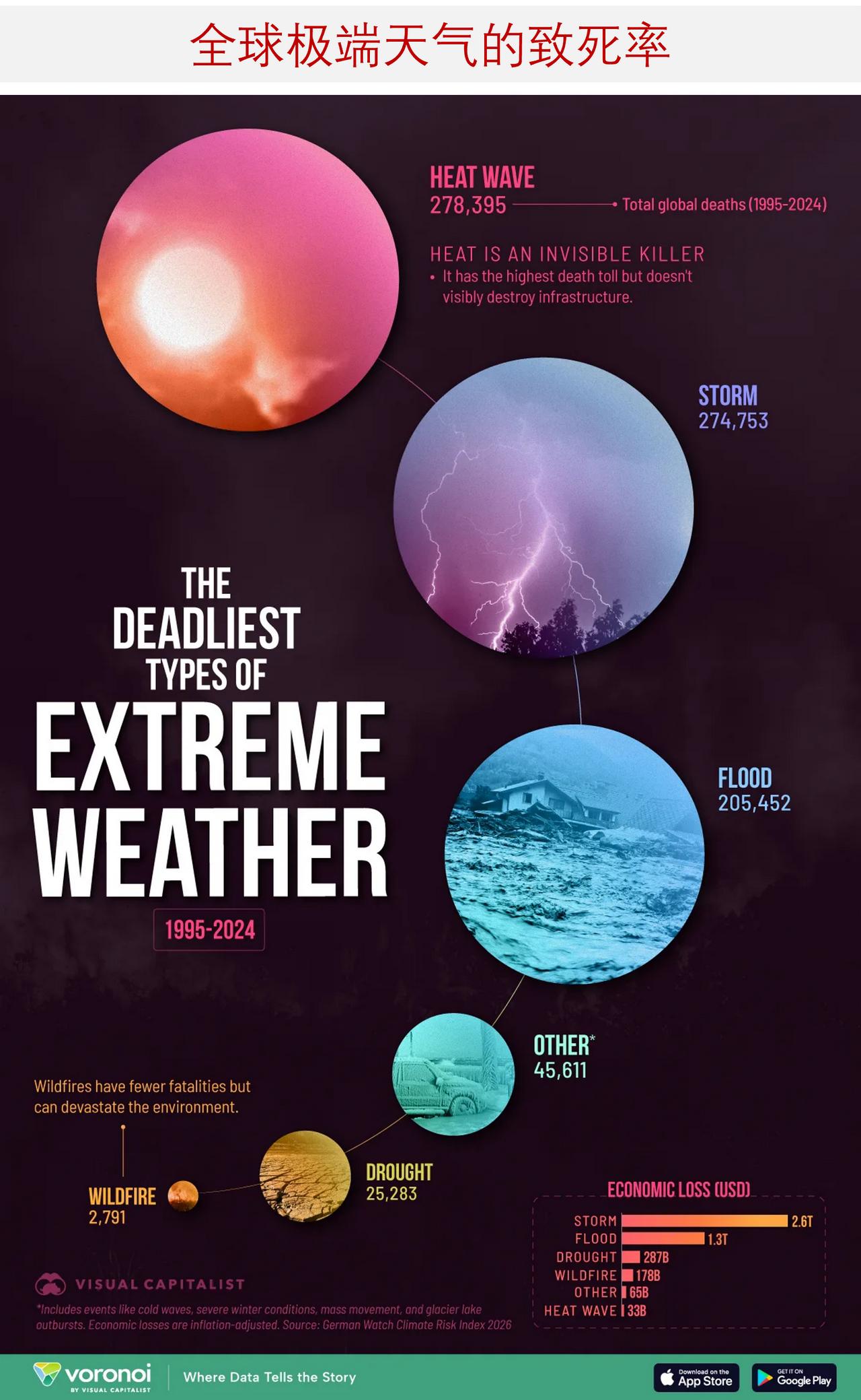 气候变化导致极端天气频发,哪类极端天气在全球致死率最高? 自1995年以来,极端天气已在全球造成超过83.2万人死亡,并带来数万亿美元的经济损失。不同灾害对人类生命造成的损失差异巨大。 下图依据德国观察(Germanwatch)《2026年气候风险指数》数据,对比了1995至2024年间全球致死率最高的各类极端天气,展现不同灾害在致死人数与经济损失上的差异。 ——热浪是致死性最强的气象灾害 1995至2024年,极端天气事件共导致超过83.2万人遇难,同时造成4.5万亿美元直接经济损失,这一规模几乎相当于英国的国内生产总值。 下图展示了各类极端天气事件的危害对比。数据显示,致死人数最多的灾害与造成经济损失最大的灾害之间存在明显分野。 热浪是致死性最强的极端天气,全球共计278,395人死于热浪。高温会加剧既有基础疾病,中暑更可能危及生命。 但热浪造成的经济损失却最低,仅为329亿美元,这也凸显出它是一种“无声杀手”,不会像其他极端天气那样留下大规模的物理破坏痕迹。 部分致死性极强的热浪发生在气候通常温和的地区。2022年,欧洲极端高温导致逾6万人死亡;2010年俄罗斯热浪则造成5.6万人丧生。 风暴紧随其后,致死人数达274,750人;同时风暴也造成了最为惨重的经济损失,高达2.6万亿美元。部分国家面临更高风险,频繁遭受风暴与气旋侵袭。 2008年,缅甸遭受纳尔吉斯气旋重创,超过13.8万人遇难;而飓风米奇则在洪都拉斯造成70亿美元损失与1.4万人死亡。两国均面临较高的飓风及相关灾害风险。 洪水包括山洪与江河洪水)导致205,452人死亡,经济损失达1.3万亿美元。 干旱与野火分别造成25,283人和2,791人超额死亡,给各国带来的直接损失分别为2,870亿美元和1,776亿美元。 寒潮、严重冬季灾害、山体滑坡及冰碛湖溃决洪水等其他灾害合计造成45,611人死亡,经济损失650亿美元,为损失规模第二低的类别。 ——对全球南方国家的非均衡冲击 气候风险指数指出,极端天气事件对全球南方国家的冲击尤为严重。报告显示,1995至2024年受影响最严重的10个国家中,有6个为中低收入国家。 这些国家身处气候变化前沿,却缺乏相应的经济能力去适应与应对。 国际社会已普遍认识到支持发展中国家的必要性。在巴西举办的第30届联合国气候变化大会(COP30)上,各国政府达成共识:到2035年,每年动员1.3万亿美元用于气候行动,并将气候适应融资规模提高三倍。