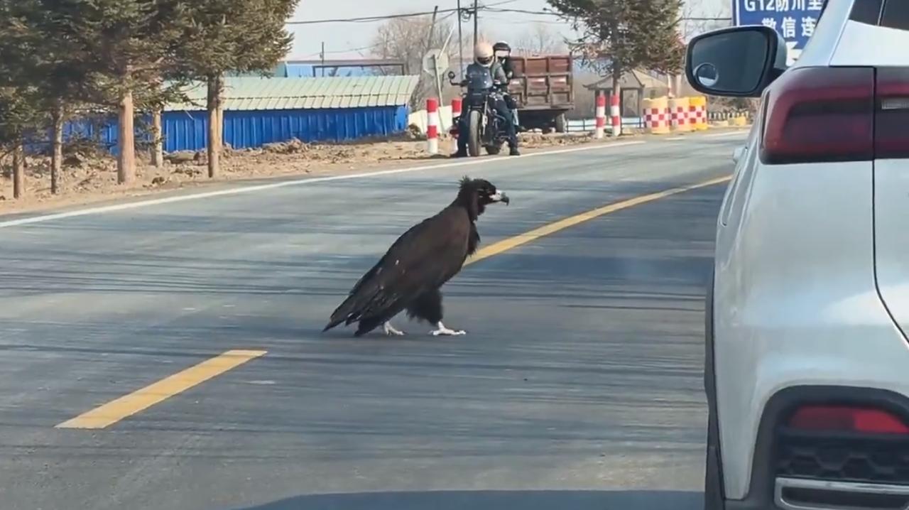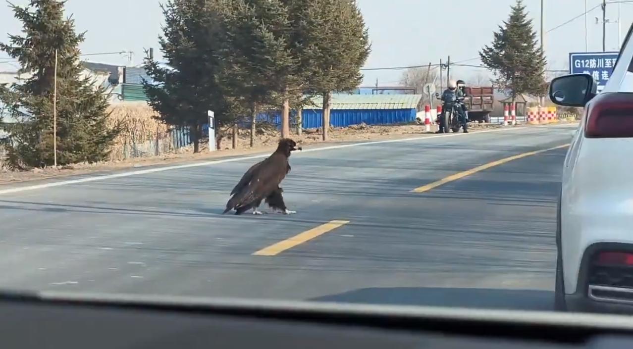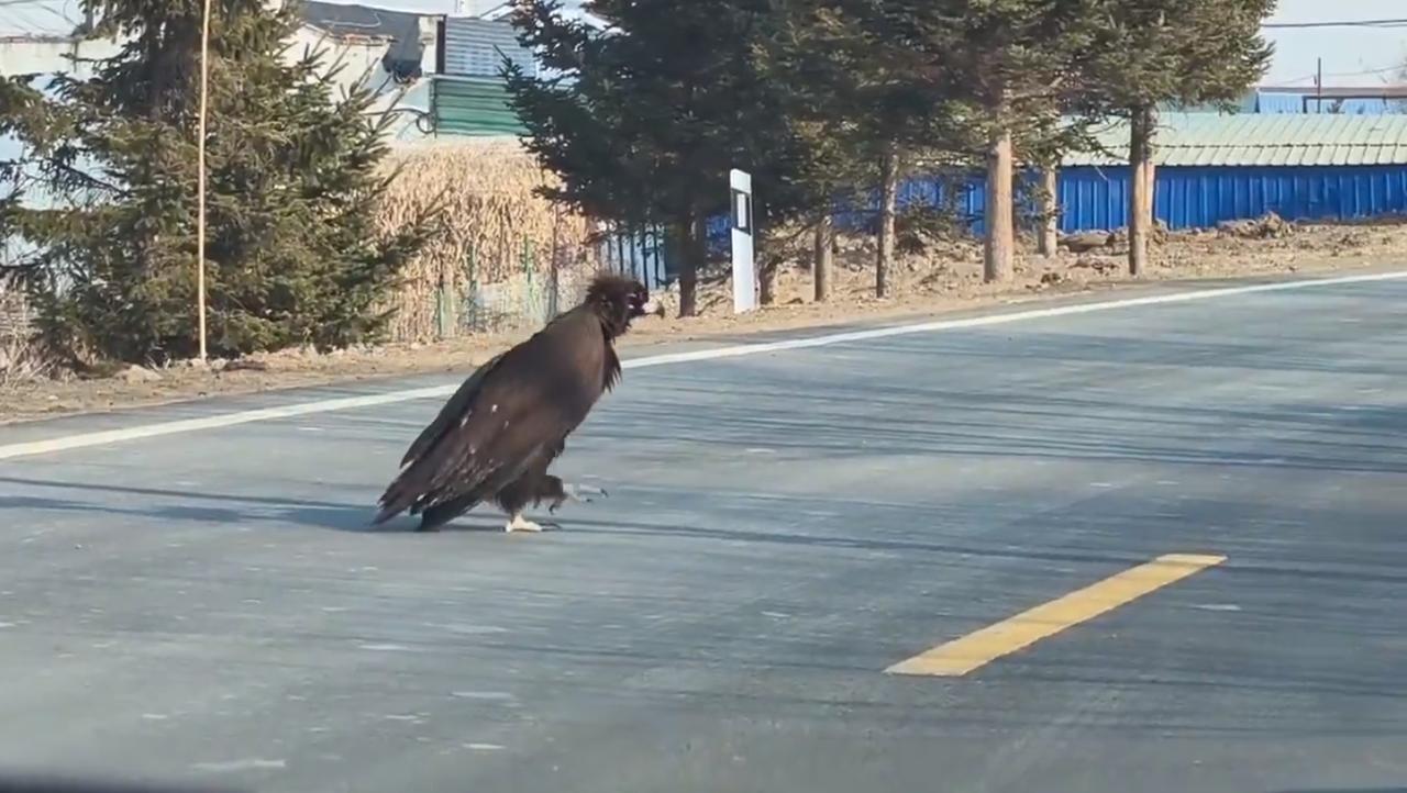 一只金雕(俗称“大雕”)正不紧不慢地沿着吉林省的一条乡村公路阔步前行,两侧的车辆纷纷恭敬地停下让路——这一罕见的瞬间,生动地展现了野生动物在人类领地中彰显其主导地位的景象。 网友的评论既包含轻松幽默的文化梗——例如将这只金雕戏称为“郭靖”那样的武侠英雄的伙伴——也饱含对当地居民有序且耐心的赞誉;。