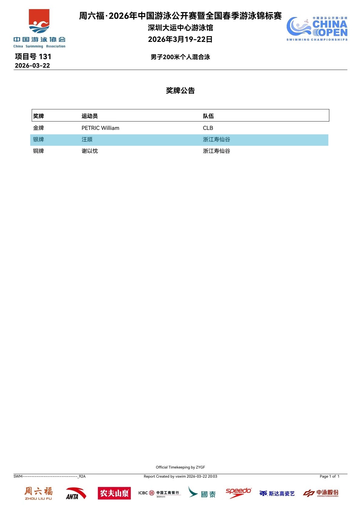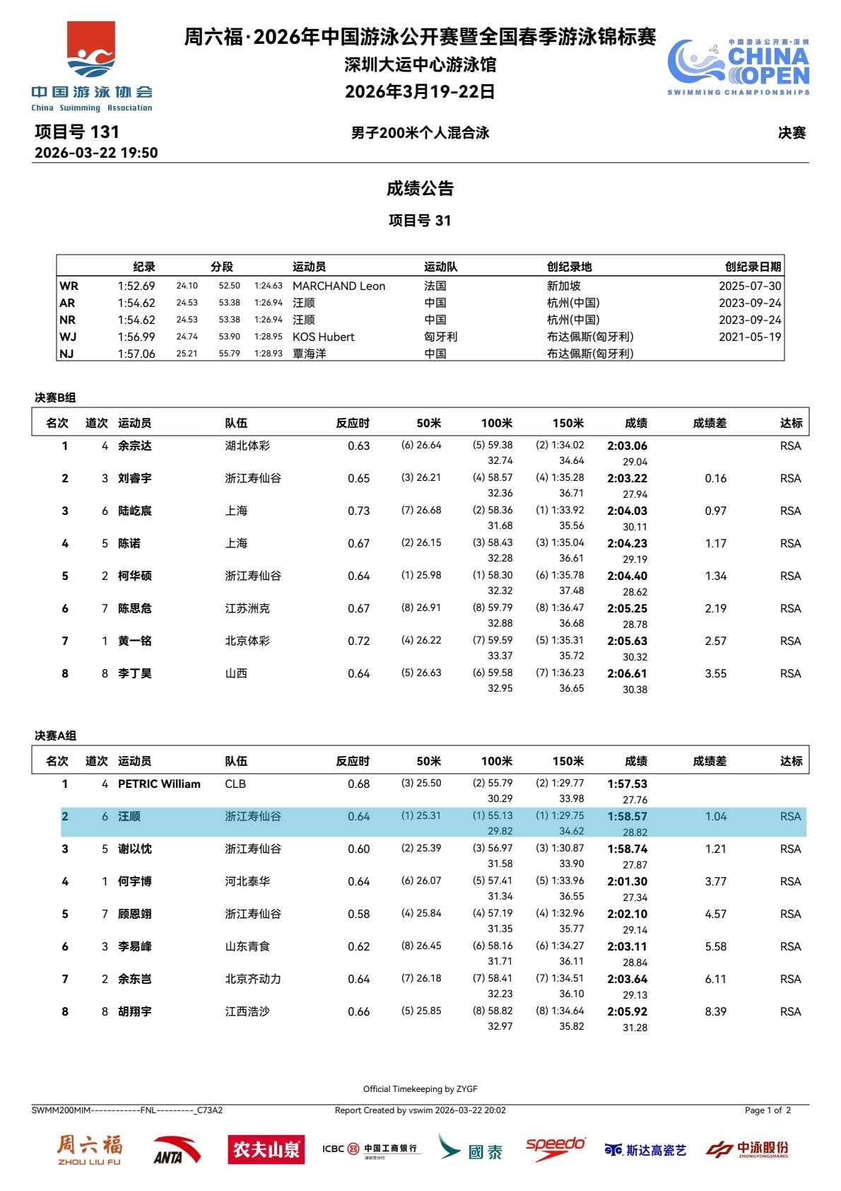 SWim进行时 『10101』20260322 中国游泳公开赛男子200m个人混合泳决赛成绩单