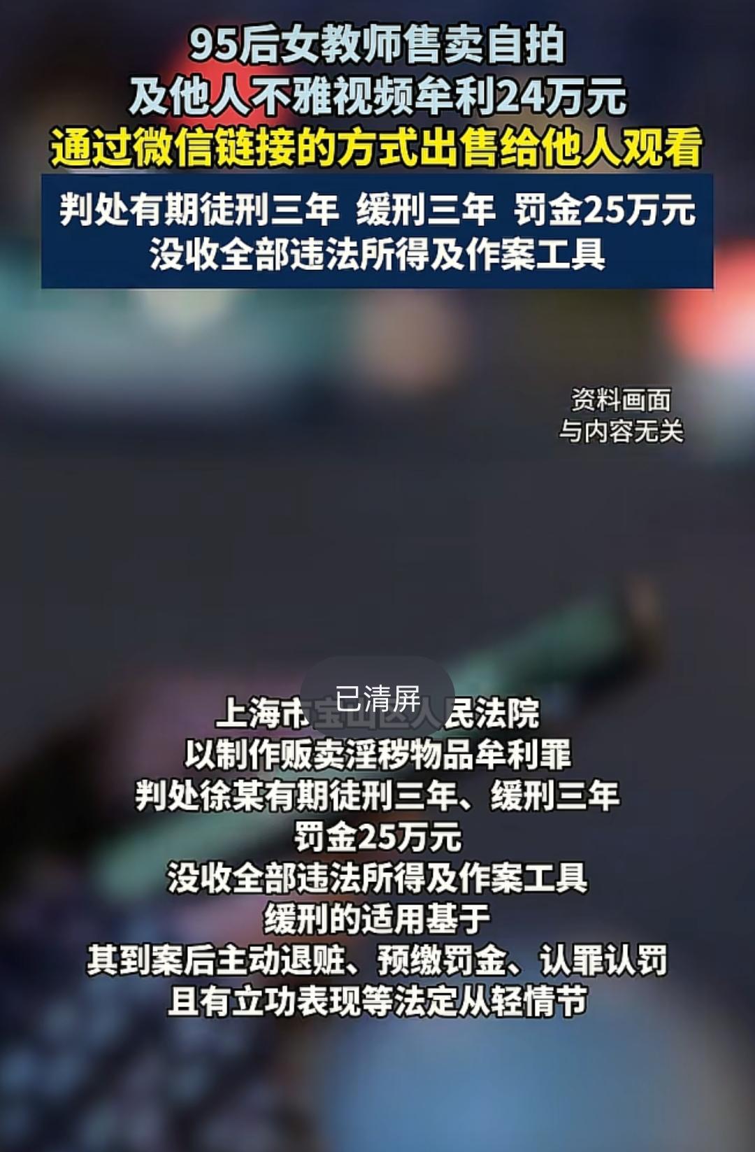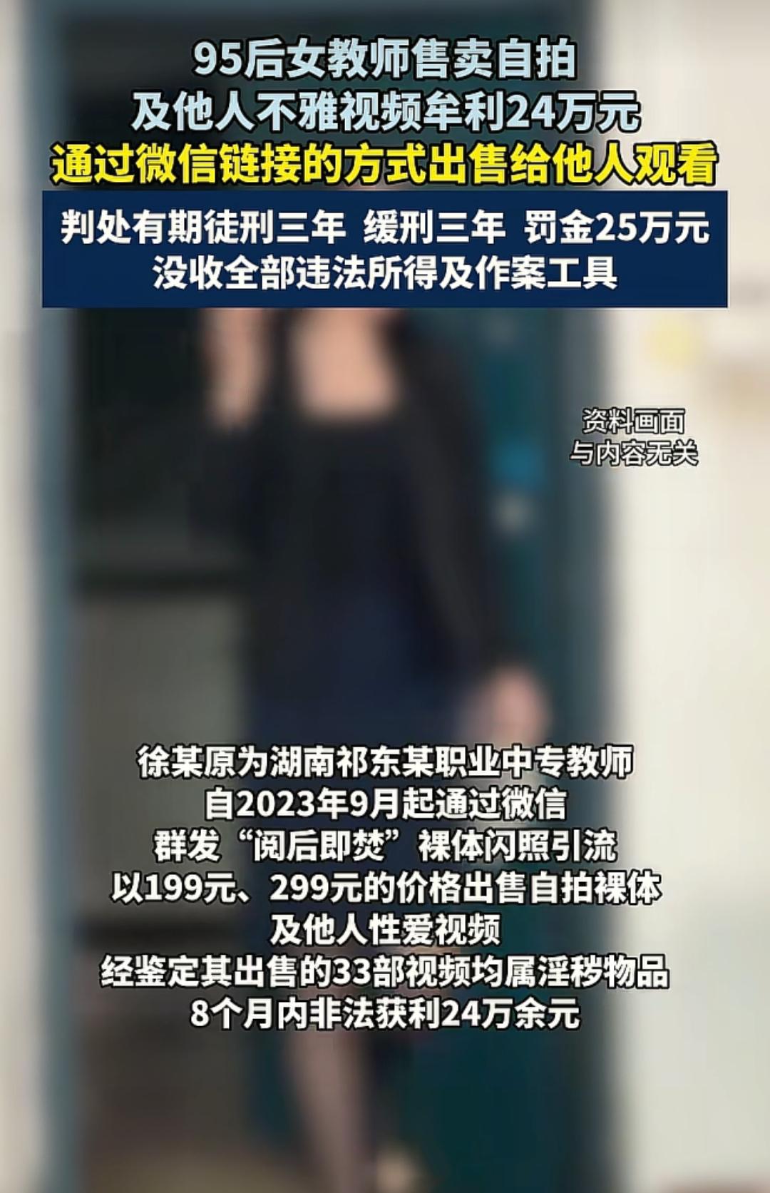 这笔账算下来,真的让人哭笑不得! 湖南祁东28岁职专在编女教师, 握着人人眼红的铁饭碗,偏要走歪路拍违规内容售卖, 199、299元一份, 靠微信发链接兜售33份, 偷偷获利24万, 还觉得互联网是隐身衣, 殊不知网络行为皆有迹可循, 转眼就被依法查处。 结局别提多讽刺, 判三缓三暂未坐牢, 可经济上直接血亏到底: 24万违法所得全额退还, 还得额外交25万罚金, 里外里倒贴一大笔。 更惨的是,教职没了、教资被撤, 终身留案底, 亲手砸了自己的大好前程。 如今考编卷到极致, 多少人熬尽心血求一个安稳编制, 她却为了几百块的快钱, 把自己的人生和未来全赌进去。 说到底不是缺钱, 是缺了对法律的敬畏, 丢了职业底线, 安稳的生活从不是用来挥霍的资本, 而是需要用心守住的底气。 你见过哪些因一时贪念, 亲手毁了安稳生活的糊涂事?