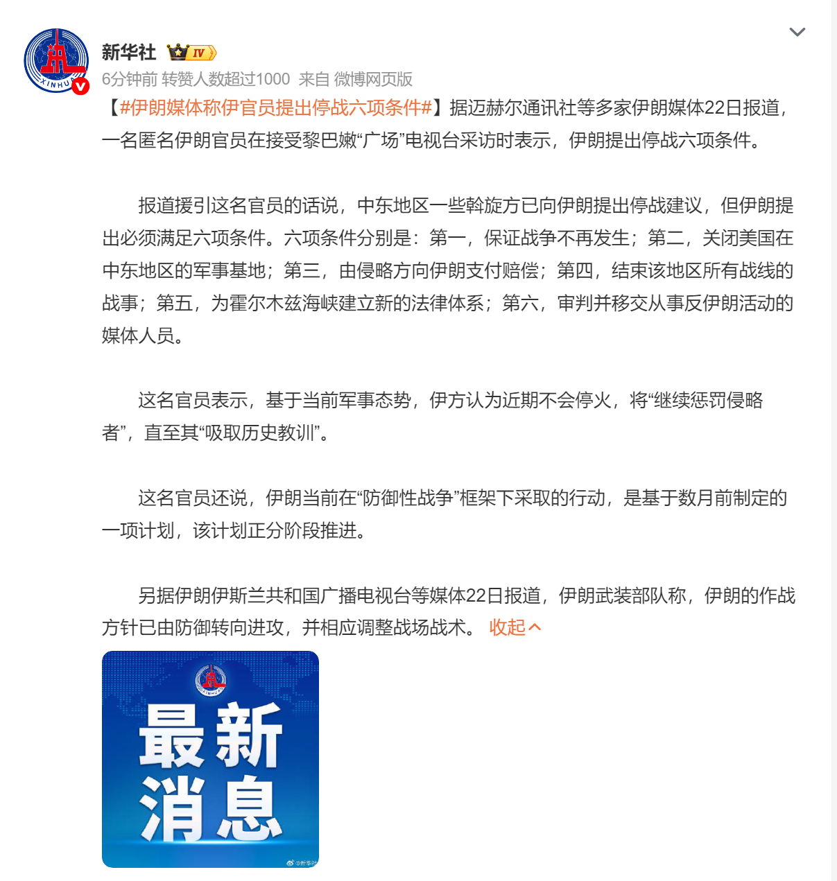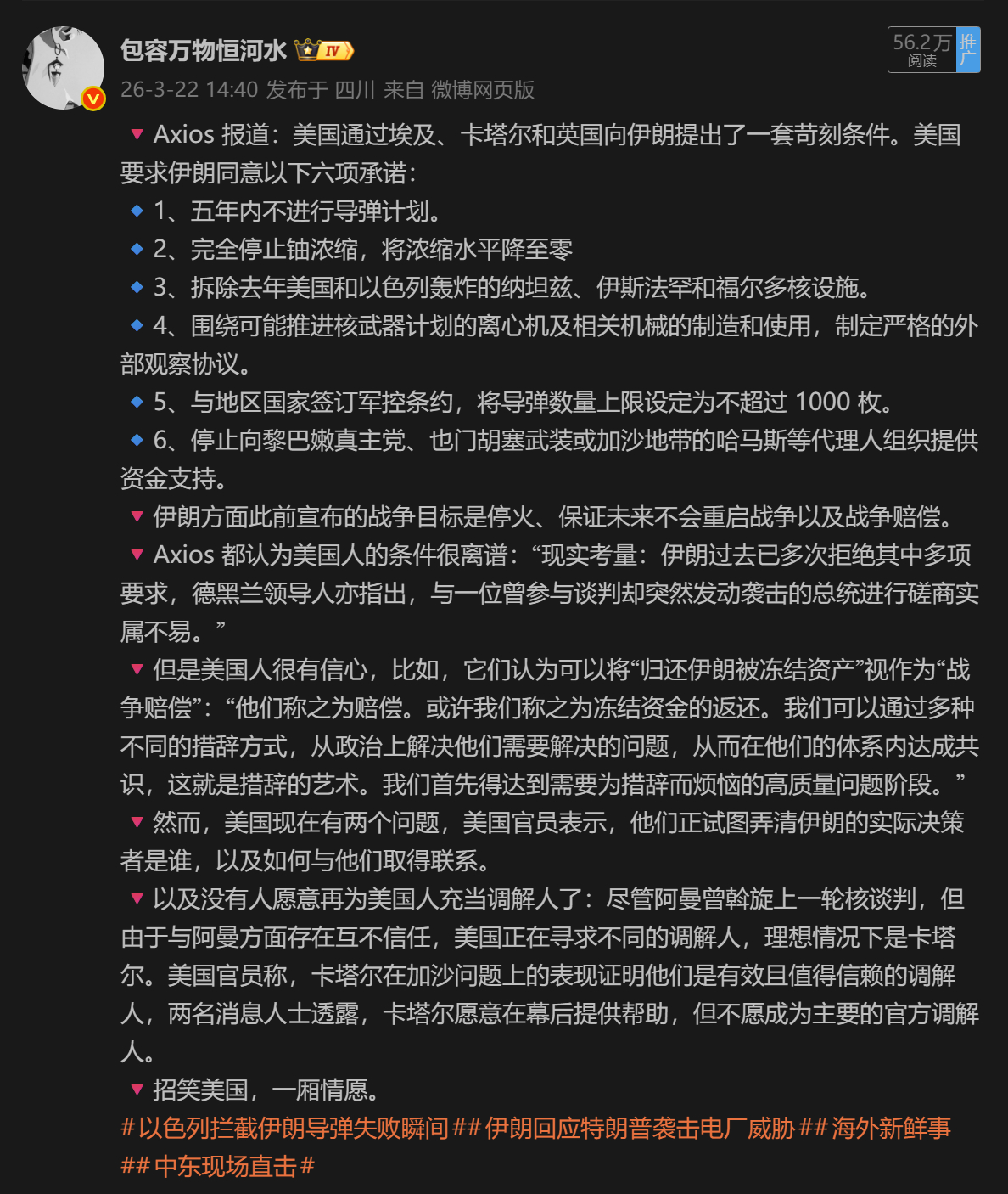 🔻从新闻报道看,双方各自摆出六项条件。🔻美国:🔹1,五年内不进行导弹计划;🔹2、完全停止铀浓缩,将浓缩水平降至零;🔹3、拆除去年美国和以色列轰炸的纳坦兹、伊斯法罕和福尔多核设施;🔹4、围绕可能推进核武器计划的离心机及相关机械的制造和使用,制定严格的外部观察协议;🔹5、与地区国家签订军控条约,将导弹数量上限设定为不超过 1000 枚;🔹6、停止向黎巴嫩真主党、也门胡塞武装或加沙地带的哈马斯等代理人组织提供资金支持。🔻伊朗:🔹1,保证战争不再发生;🔹2,关闭美国在中东地区的军事基地;🔹3,由侵略方向伊朗支付赔偿;🔹4,结束该地区所有战线的战事;🔹5,为霍尔木兹海峡建立新的法律体系;🔹6,审判并移交从事反伊朗活动的媒体人员。伊朗媒体称伊官员提出停战六项条件伊朗导弹在以本土砸出直径10米深坑海外新鲜事中东现场直击