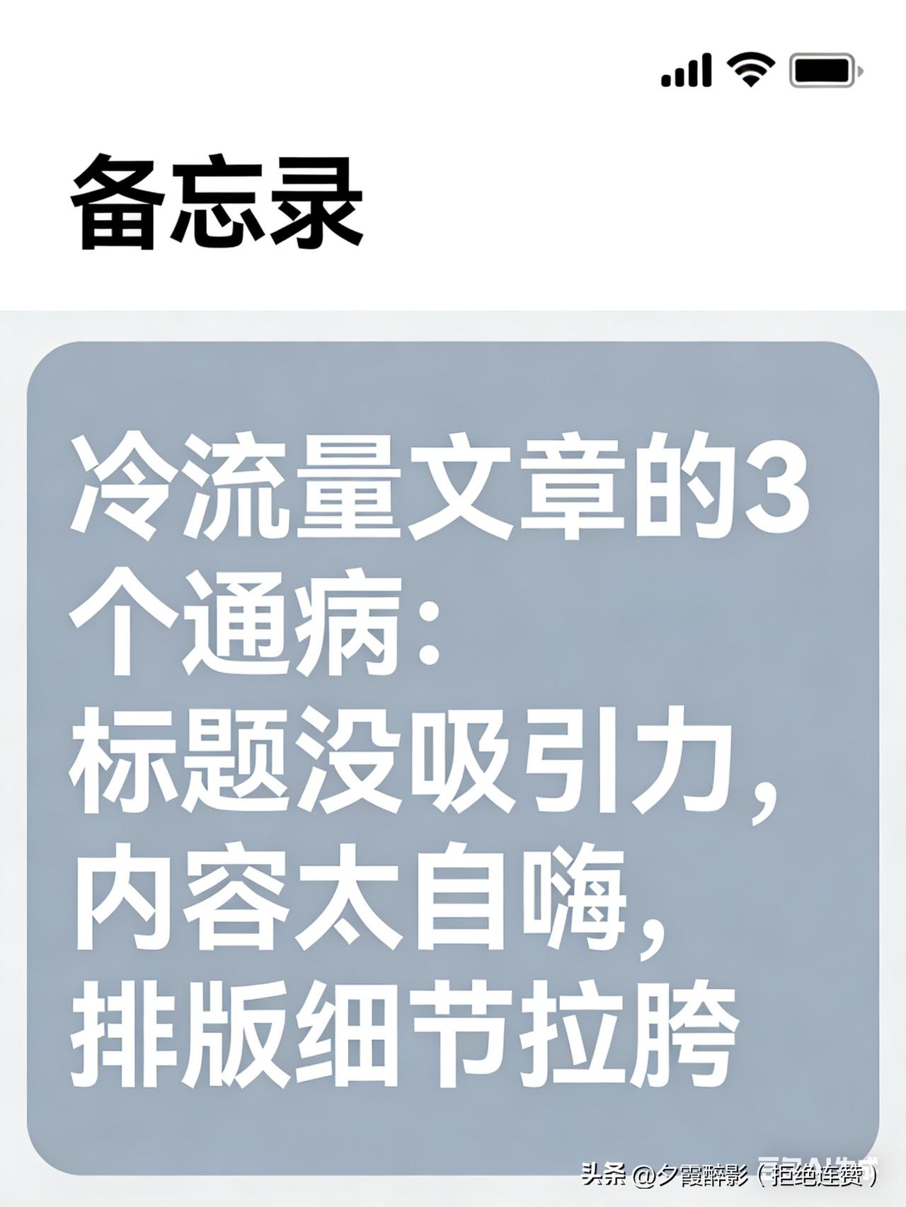 刚经历过一段“零播放、冷流量”的日子,今天结合自己踩过的坑,好好拆解下那些低阅读量文章的“通病”,给还在坚持的同路人提个醒,少走弯路! 结合我最近的冷流量经历,发现没流量的文章,基本都逃不过这3个核心问题,每一个都戳中痛点: 1. 标题像“记笔记”,完全抓不住眼球 那些阅读量惨淡的内容,标题要么太直白、太随意,要么全是自说自话,没有任何吸引力。 比如我之前写日常,标题就是《今天做了酸菜鱼》,平平无奇,刷到的人根本不知道里面有没有干货、有没有情绪点,自然懒得点。 而爆款的标题,要么有情绪共鸣,要么有明确价值,要么带点悬念,能让人一眼就想点进来看看。 2. 内容太“自嗨”,没给读者提供任何价值 这是最致命的!很多时候我们写着写着,就陷入了“自嗨陷阱”——只记录自己的想法、日常,完全没考虑读者想看什么。 低流量的文章,要么是纯流水账,没有任何干货、情绪价值或谈资;要么观点零散,没有重点,读者读了半天,不知道你想表达什么,也没收获任何东西,自然不会点赞、评论。 就像我之前写创作感悟,东一榔头西一棒子,没有结合具体案例,也没给新手提供可落地的建议,读着就很空泛。 3. 排版+互动“拉胯”,劝退读者 细节也很关键!低阅读量的文章,普遍存在排版混乱的问题——大段文字密密麻麻,没有分段,没有小标题,没有配图,看着就累,读者扫一眼就划走了。 而且这类文章几乎没有互动点,通篇都是独白,没有留出让读者评论、交流的话题,无法引发共鸣,数据自然就冷冷清清。 其实那段冷流量的日子,真的很让人焦虑,甚至想过放弃。但回头想,低阅读量不是坏事,它是在帮我们找问题、改不足。 找准问题,调整标题、打磨内容、优化排版,再坚持下去,爆款肯定就在路上! 大家最近有没有遇到冷流量?都踩过哪些坑?评论区聊聊,一起共勉! 新手做头条 阅读量低怎么办