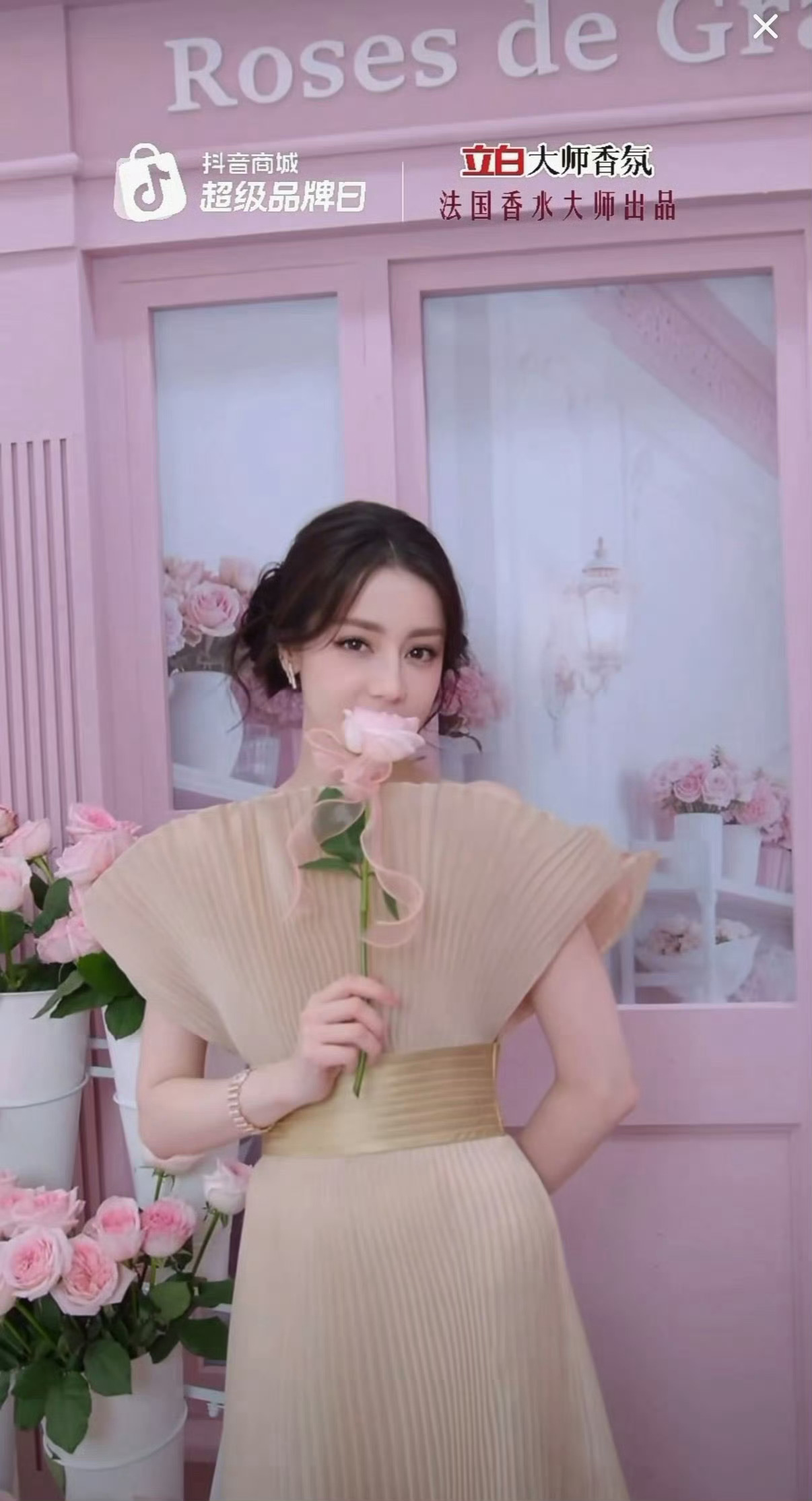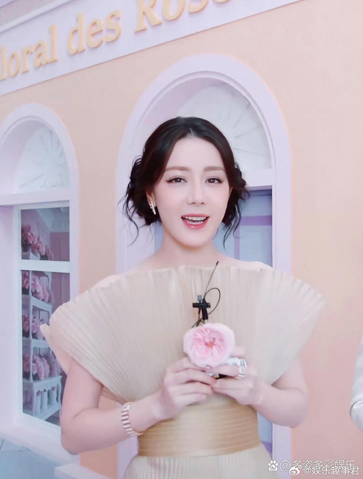 迪丽热巴直播迪丽热巴穿着高定裙直播,状态非常好,就是挽起头发,
