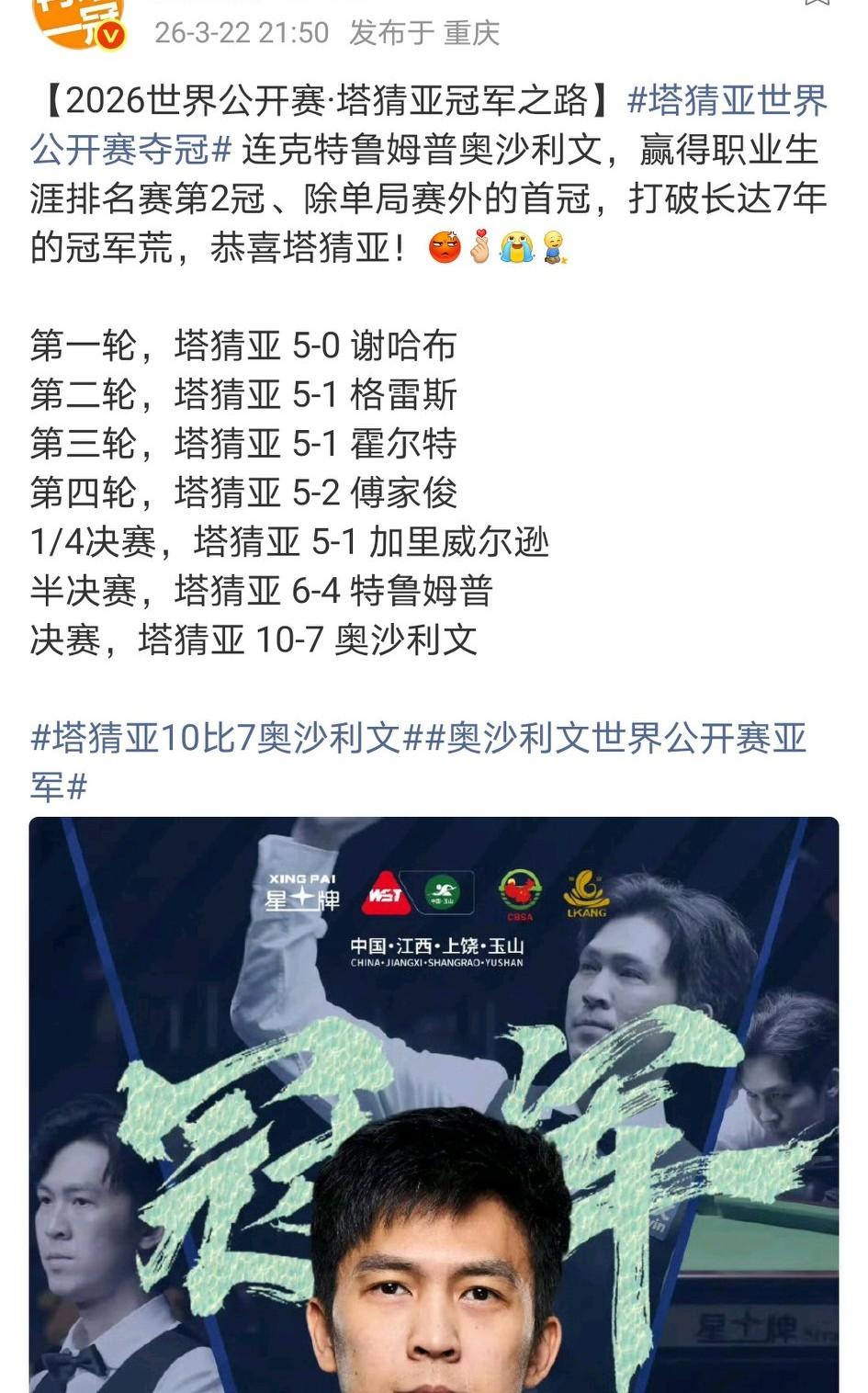 苏宁 1 2026-03-23 06:49 单杆最高奖规则既定,无话可说,但于情于理,147更值得获此殊荣与奖金!塔猜亚,好样的👍 有时终需有 回复 03-23 15:24 147年年有好多杆150以上很少 无双 回复 03-23 12:16 147年年都好多杆,超越147的记录目前就148和153[捂脸哭][捂脸哭][捂脸哭]只能说147值得满分奖[点赞]