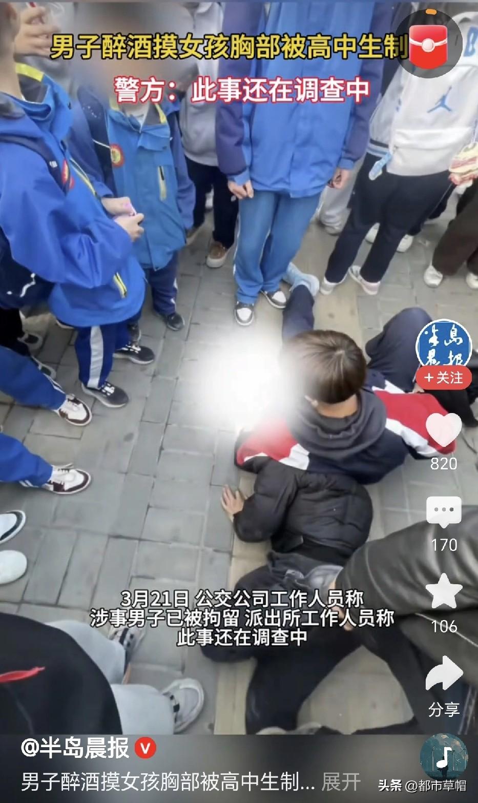 色胆包天!醉酒男公交车上众目睽睽下公然摸初中女生胸,被女生指责后还打了女生的嘴。同车一名高中男生见状护住女生,并打电话报警并通知女生家长。醉酒男见势不妙慌忙下公交要逃,高中男生追下车一把将他放倒在地。真是大快人心! 这是3月20日发生在陕西延安的事情。该出手时就出手,这个高中生的行为值得点赞!公共场所公然猥亵初中女生,被揭露后还打了女生,醉酒男真的是色胆包天。对这样目无法纪的狂妄之徒,我们决不能任其为所欲为。很多时候,歹徒之所以无法无天,并在众目睽睽下得手,就是因为人们的懦弱、漠视和纵容。这名高中男生路见不平,及时出手相助,维护了公序良俗,展现了浩然正气,让违法犯罪分子逃无可逃。 据公交公司工作人员称,涉事男子已被公安机关拘留,案情还在进一步调查中。