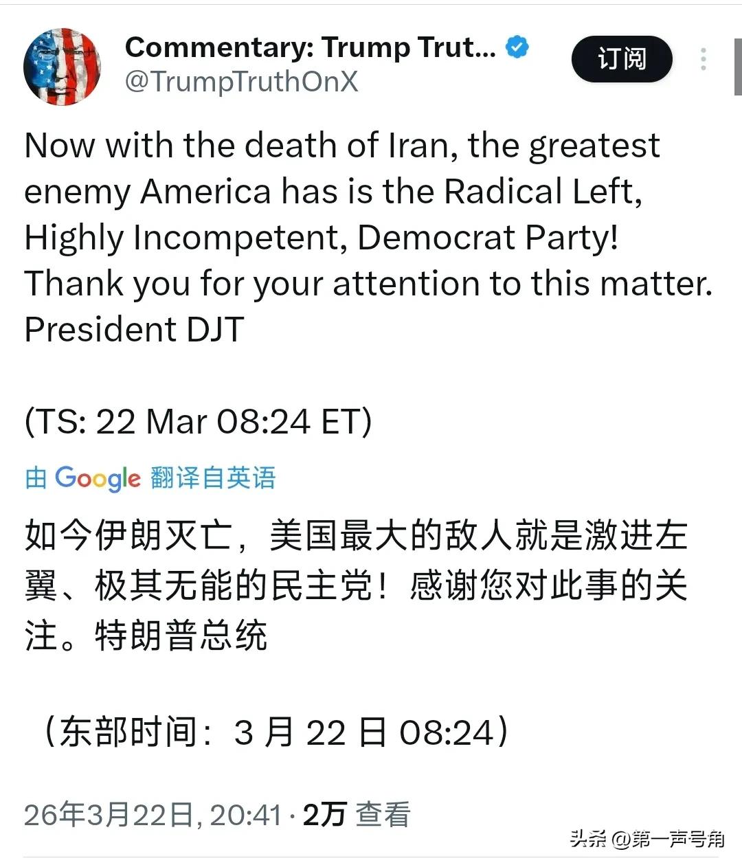 特朗普今晚(北京时间3月22日晚)写道:“如今伊朗灭亡,美国最大的敌人就是激进左翼,极其无能的民主党!感谢您对此事的关注。” 评几句 特朗普突然改口:打完伊朗,最大敌人竟是美国内? 刚刚,特朗普公开放话,宣称伊朗已被“消灭”,随即话锋一转,将国内激进左翼、民主党列为美国头号威胁。这番言论堪称经典的“美式政治剧本”。 对外强硬造势、转移视线,对内疯狂攻击、激化党争,是特朗普一贯的操作。一边在国际上制造对抗、渲染战果,一边把国内矛盾摆上台面,把外交战场当竞选舞台。 事实上,伊朗并未灭亡,中东局势依旧紧绷,霍尔木兹海峡危机未消。特朗普这番话,与其说是外交宣言,不如说是竞选喊话。当一个大国总统,把国外对手“宣布消灭”,转头就把国内政敌当成头号大敌,足以看出美国当下的撕裂与混乱。 强者对外谋大局,弱者对内搞对立。美国如今的样子,恰恰印证了这句话。