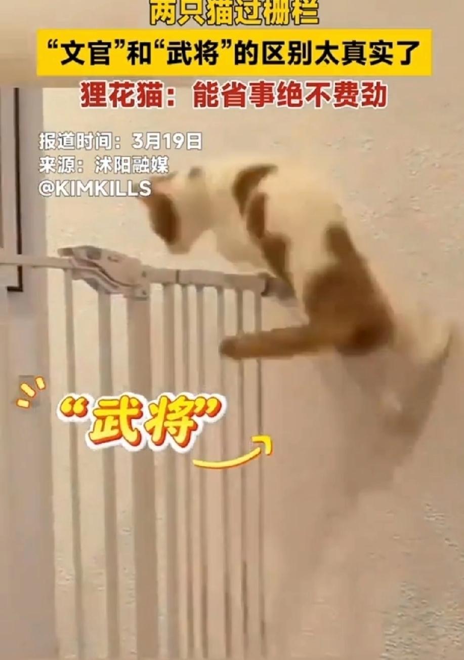 新华社发布了一段很有意思的视频,一橘一狸花两只猫结伴过楼道。两只猫被一道栅栏拦住了。橘猫勇猛顽强,无所畏惧。它像一阵风似的,冲到墙边腾空而起,借助墙的反弹力,跃过了栅栏。 狸花猫沉着冷静,前去观察一下栅栏。发现有个小门没锁,它轻松将的把门打开。有意思的是,狸花猫回头看了一下,似乎在说,就这,拦得住我们吗?随后通过了栅栏。 网友们给橘猫取了名字叫武将,狸花猫叫文官。一文一武,彰显了两只猫有勇有谋,就可以战胜困难。 办法总比困难多。这道栅栏只能阻止那些懒惰的猫。这两只猫没有被栅栏吓住,而是积极想出克服困难的办法,”八仙过海,各显神通”,通过了栅栏。或许,这就是这段视频的意义吧。各位网友们,你们怎么看? 新华社猫开栅栏视频 两只猫