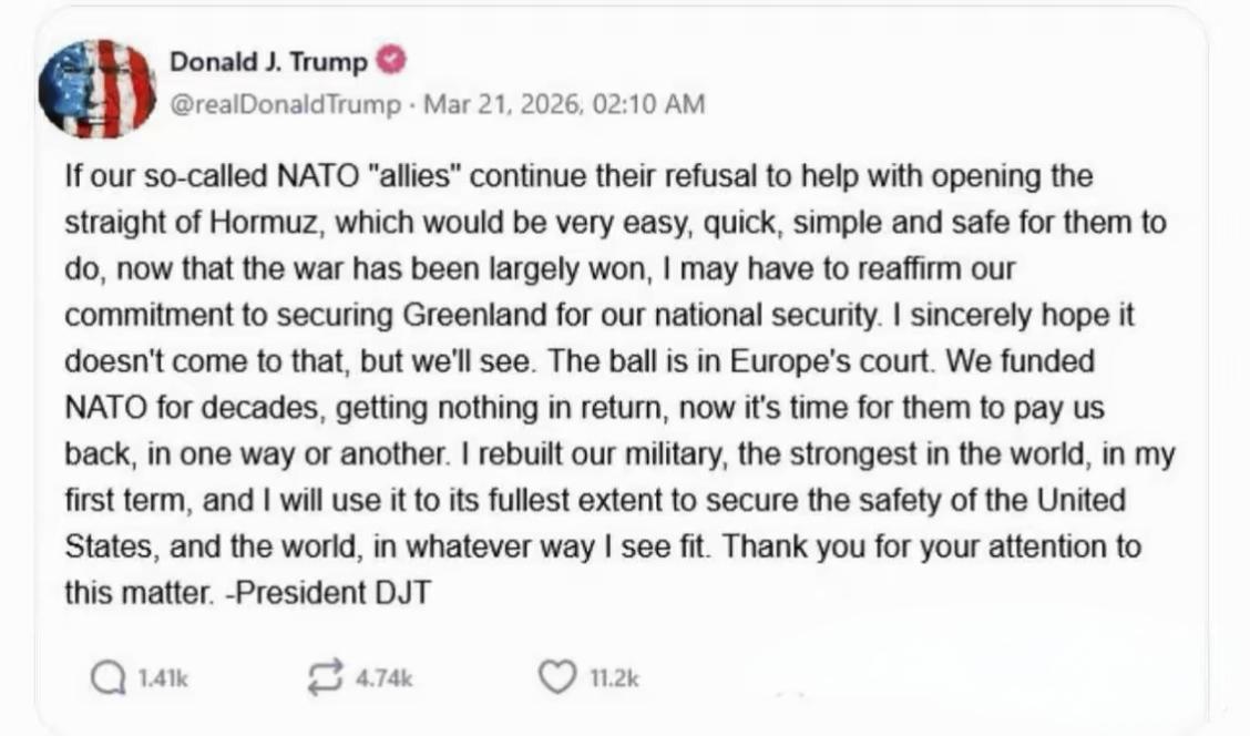 美国总统:别忘了格陵兰岛!当地时间3月21日,美国总统在其社交媒体账号上发文称:“如果我们所谓的北约‘盟友’继续拒绝协助开启霍尔木兹海峡(此举对他们而言非常容易,快捷,简单且安全,因为战争已基本结束),我可能不得不重申我们为确保格陵兰岛安全而对国家安全的承诺。我衷心希望这种情况不会发生,但我们拭目以待。”看到这个帖子,相信不只是网友们会觉得不可思议,美国的北约“盟友”们只怕也会苦笑不已!这是什么意思?特朗普的意思很明白,如果美国的北约“盟友”们继续拒绝协助护航霍尔木兹海峡,那么他将重新将格陵兰岛纳入“获取”考虑。北约“盟友”们会做何选择呢?一边是北极安全必须是牢牢守住,一边是要尽量避免陷入中东冲突的“泥潭”,两难啊!真的是让人哭笑不得啊,明明美国闯了大祸,现在却叫别人一起来承担后果,还有公理吗?