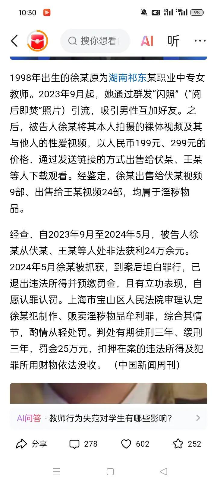 祁东女教师徐某工作没了,身体也看了,赚了24万罚了25万还要蹲三年,你说你图啥啊。 1998年出生的徐某,在2023年9月至2024年5月间,借着教师身份的掩护,在网络上用特殊手段吸引男性用户,随后出售自己拍摄得私密影像,短短八个月,她非法获利超24万元,以为找到赚快钱的捷径,没料到早已触犯法律红线。 上海市宝山区人民法院审理后,认定她犯制作、贩卖淫秽物品牟利罪,判处有期徒刑三年、缓刑三年,同时处罚金25万元,她此前赚的钱不仅全部吐出,还倒贴一万元。 更严重的是,她地教师职业被彻底撤销,终身不得踏入教育行业,还留下了伴随一生的刑事犯罪记录,即便到案后她坦白罪行、退还赃款,甚至有立功表现,也无法抵消行为造成地恶劣影响。 这起案件的核心争议,在于她身份与行为的巨大反差,作为本应为人师表的教师,她的做法不仅违背职业操守,亦给整个教师队伍的形象抹黑,让不少家长和网友难以接受。 有人说,或许是农村教师薪资不高,家庭压力大才让她走歪路,但更多人认为,无论生活有多难,都不能逾越法律和道德的底线,出卖尊严换钱地行为不值得同情。 “真有人这么干、八个月赚24万,最后亏大吧、”不少网友发出这么个样地感慨,还有人结合身边经历提醒,看似轻松的快钱背后,往往藏着难以承担的代价。 从令人尊重的教师,到留下案底的罪犯,徐某的经历,是对所有心存侥幸者的警示、她为眼前地利益,放弃职业、尊严和未来,最终落得竹篮打水一场空的结局! 我们不禁要问,在面对生活困境时,到底该如何守住底线,避免走上违法犯罪的道路 。 在本人看来,生活里地难处谁都有,但赚钱必须取之有道、哪怕起点低、压力大,也可以靠双手踏实努力,一步步改善生活,像徐某这样抱的侥幸心理走捷径,看似赚了快钱,实则是在透支自己地整个人生,实在太不值得。 这事你怎么看?