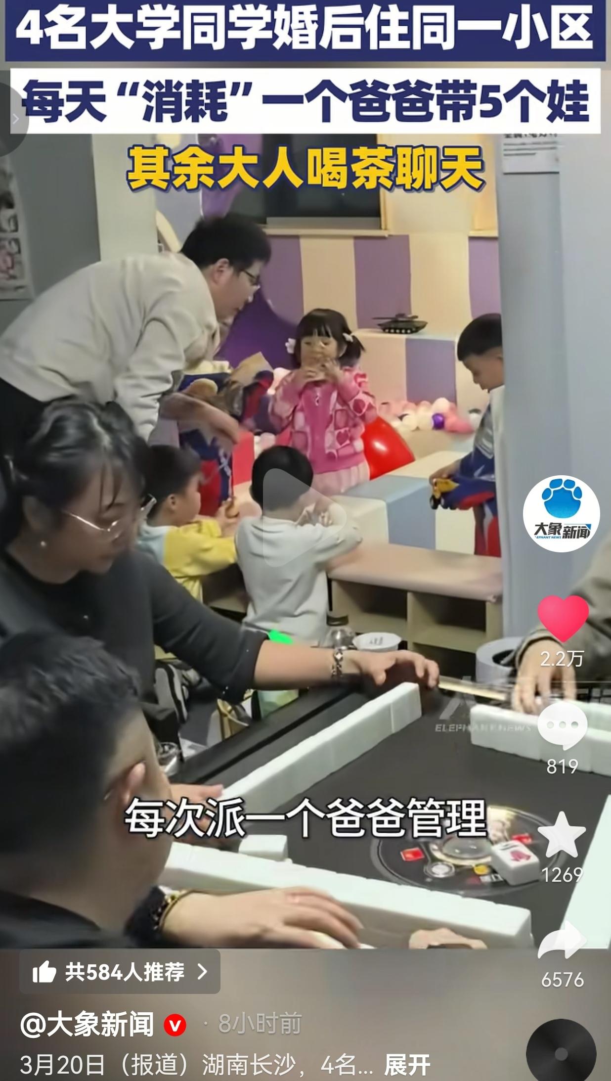 长沙4个大学同学住同小区,每天1个爸爸带5个娃,其余7人喝茶打麻将!网友:羡慕哭
