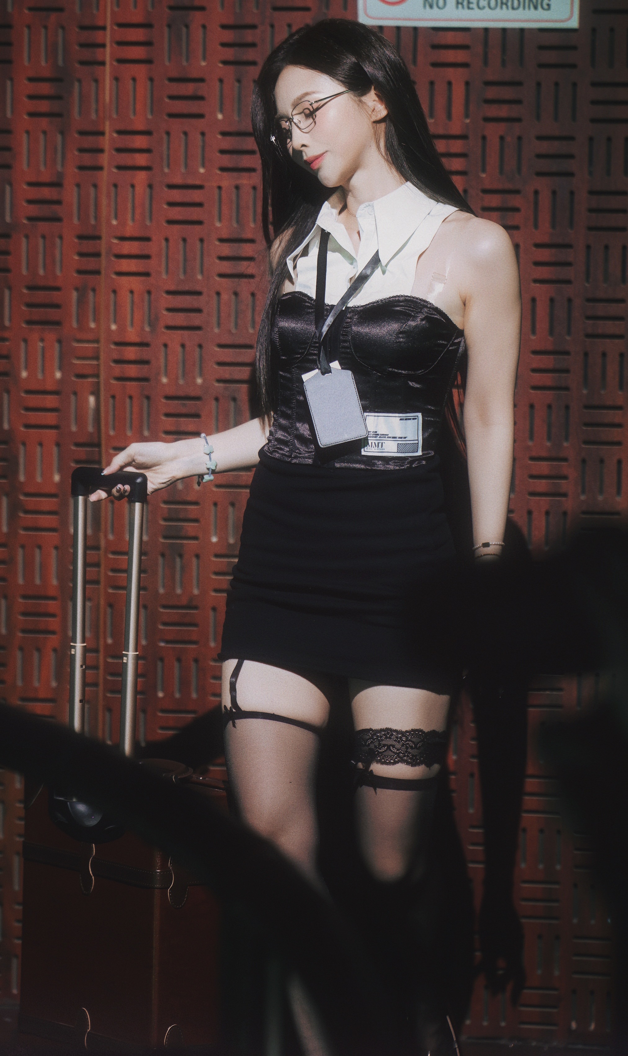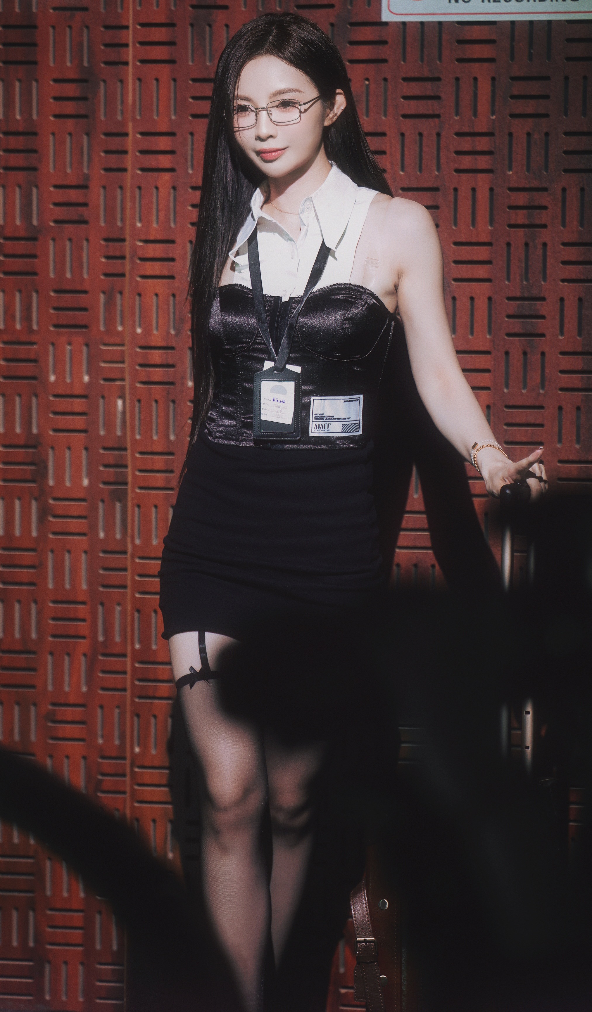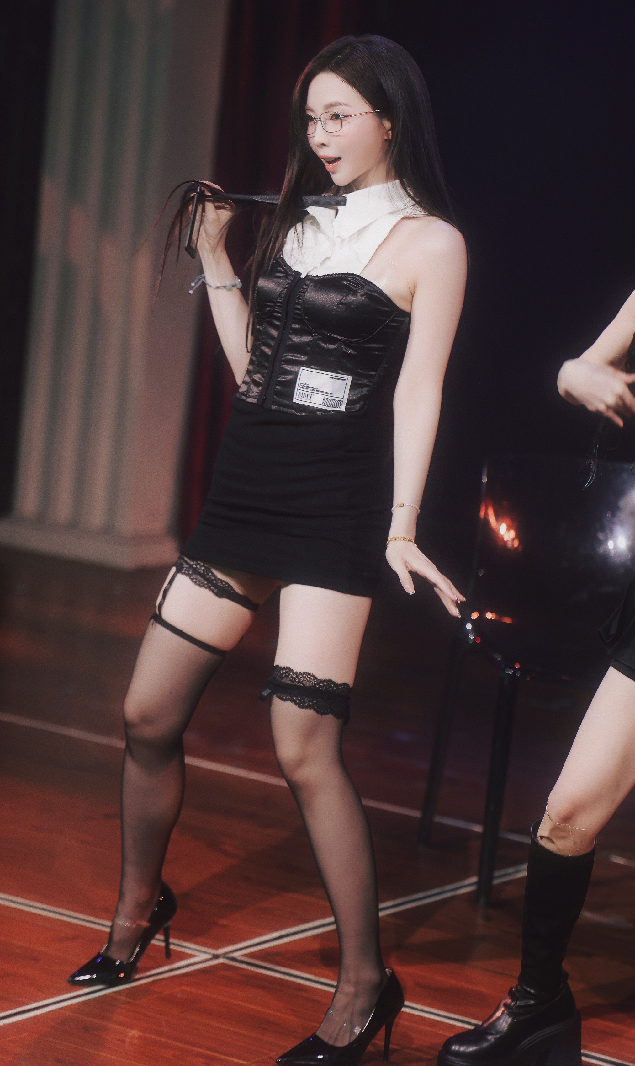 许杨玉琢 许杨玉足大长腿黑蕾丝边黑丝黑色漆皮尖头细高跟