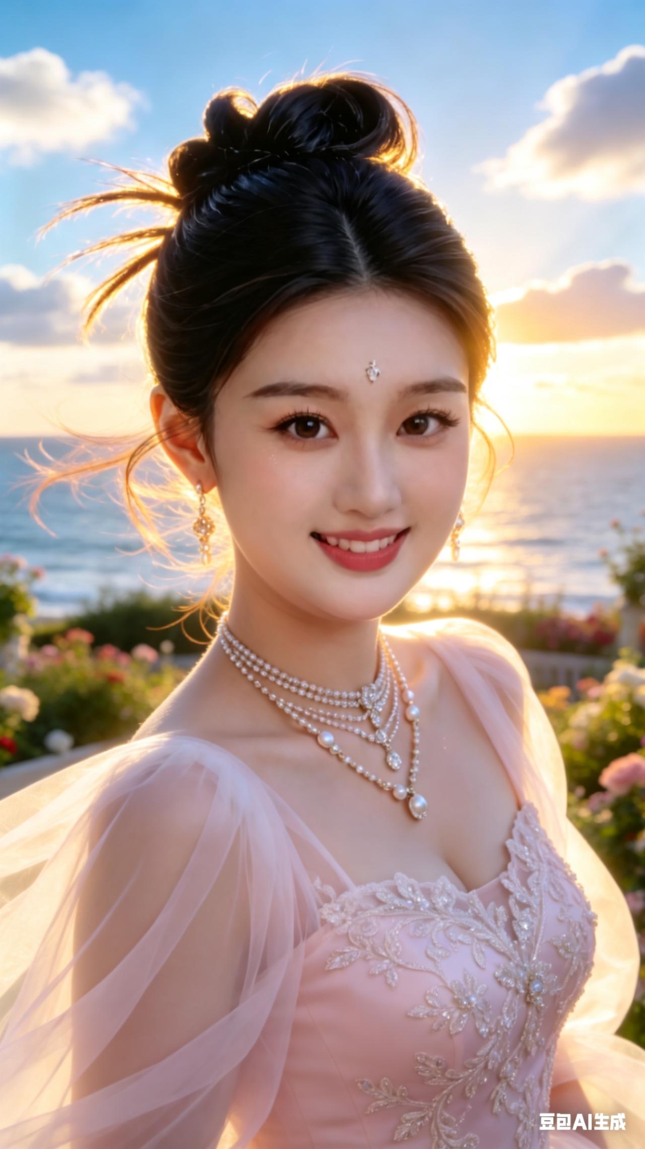 想象一下,在梦幻的海边,一位优雅公主身着飘逸白裙,宛如海中精灵。她脖颈间的珍珠项