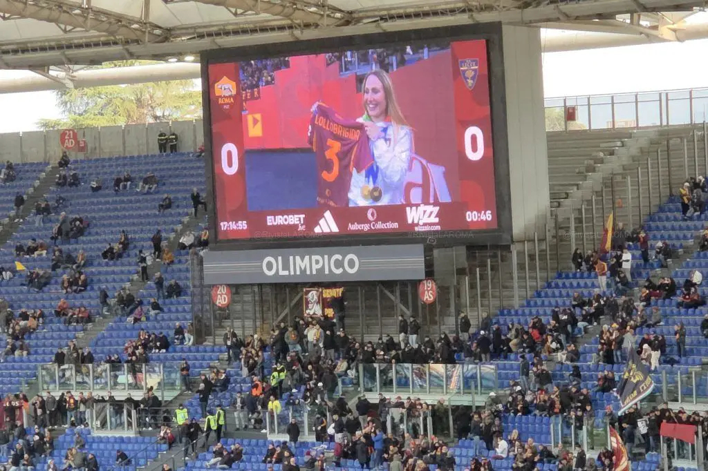 冬奥会双金得主洛洛布里吉达今天受邀来到奥林匹克球场,并且获赠了罗马球衣,以后常来