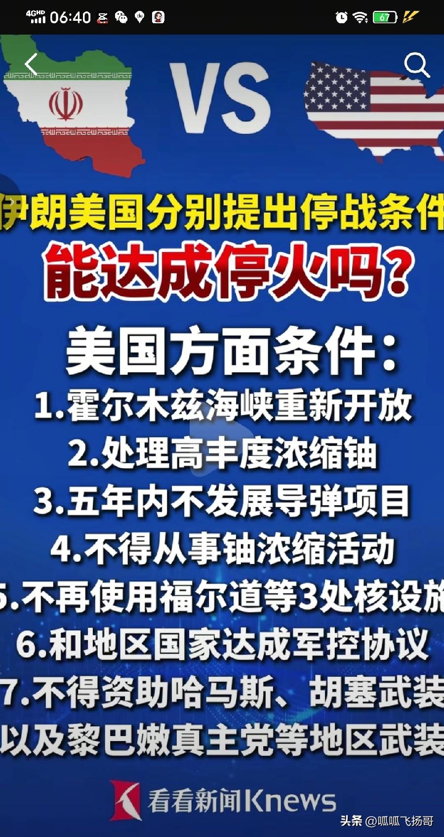 这哪里是停战条件,分明是让老美跪下认错,还抽他的耳光! 老美想停战可以, 必须: 1.保证战争不再发生 2.关闭美国在中东地区的军事基地 3.由侵略方向伊朗支付赔偿 4.结束该地区所有战线的战事 5.为霍尔木兹海峡建立新的法律体系 6.审判并移交从事反伊朗活动的媒体人员 美国数字网站新闻报道,美国内部起草的和平方案内容大致有6条。 1.伊朗在5年内不得开展导弹研发计划 2.伊朗完全停止铀浓缩,将浓缩水平降至零 3.伊朗应拆除去年被美以轰炸的纳坦兹伊斯法罕和福尔多核设施 4.伊朗应对推进核武器计划的离心机及相关设备的制造和使用建立严格的外部监督机制 5.伊朗应对地区国家签订军控条约,自身装备的导弹上限不超过1000枚 6.伊朗放弃对黎巴嫩真主党加沙哈马也门胡塞武装等代理人的支持 这样的和平方案如果属实, 看来老美还在幻想伊朗可能投降。 你提你的要求,我做我的美梦。 脱不脱离现实完全不管, 双方都主打一个犟, 看来只有打到哪一方打不动了,彻底痛了, 才有一方做出妥协,才有可能结束战争!