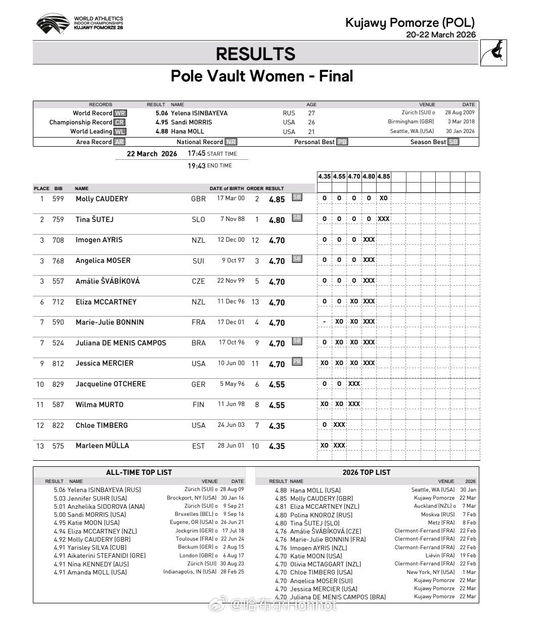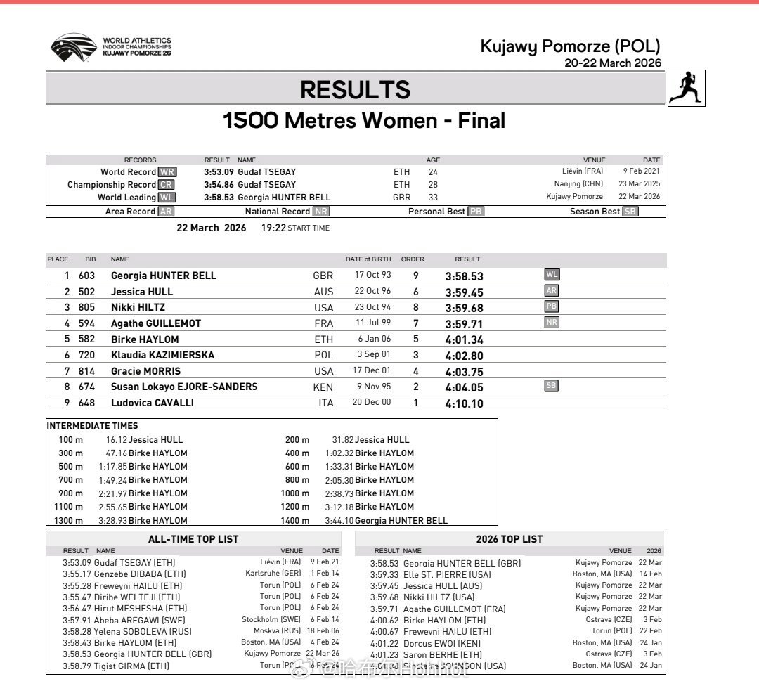 2026年托伦室内田径世锦赛 最后一个单元,霍奇金森、亨特贝尔、莫莉三人,分别在800、1500和撑竿跳高赛场拿下金牌,英国之夜。田径说一哈你不知道的田径故事