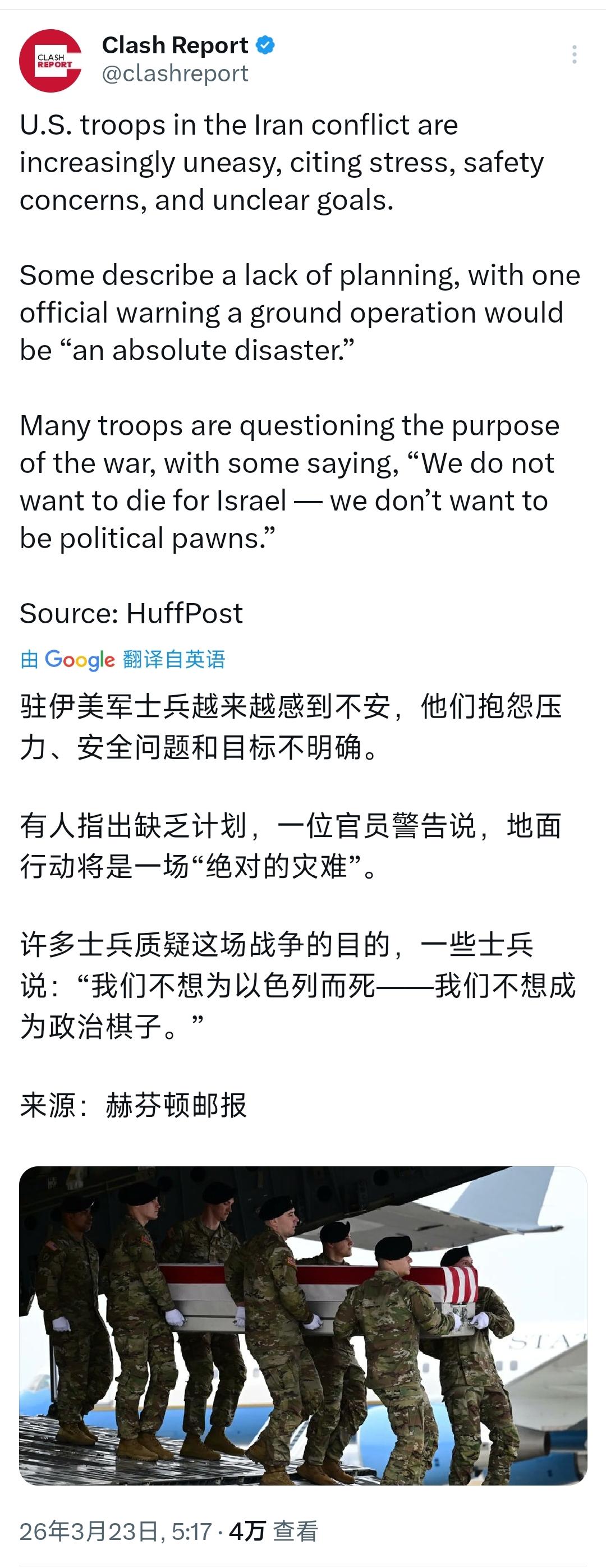 驻伊美军士兵越来越感到不安,他们抱怨压力,安全问题和目标不明确。有人指出缺乏计划,一位官员警告说,地面行动将是一场“绝对的灾难”。许多士兵质疑这场战争的目的,一些士兵说:“我们不想为以色列而死我们不想成为政治棋子。”来源:赫芬顿邮报 [机智]评几句:驻伊美军前线的质疑声,与美国国内的反战浪潮同频共振,士兵们对战争目标模糊、沦为以色列棋子的不满,正是民众心中困惑的精准复刻。这场为他国利益燃起的战火,失去合理性的速度远超近年任何一场军事行动,既无清晰作战计划,还被警告地面行动将成灾难,前线士兵深陷压力与不安,后方民众怒斥战争徒劳,内外皆疑的困局,早已戳穿这场军事行动的荒谬本质。