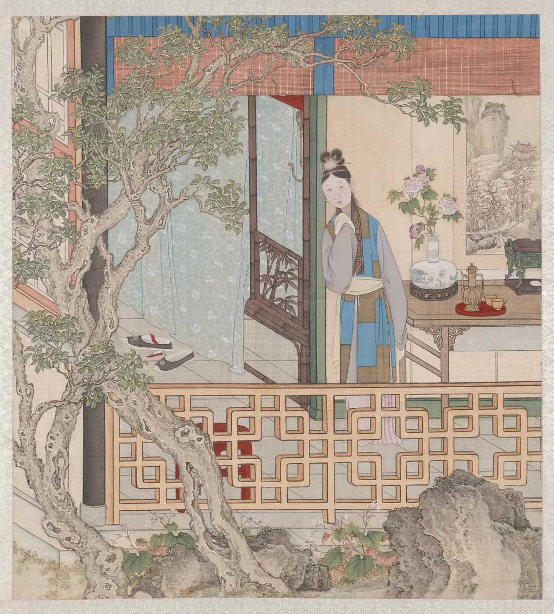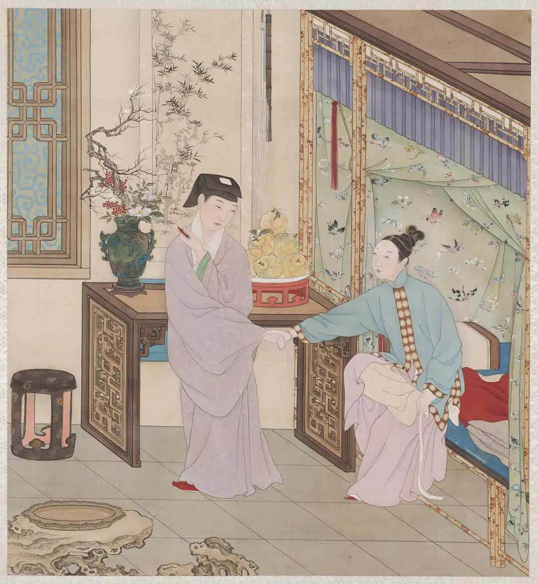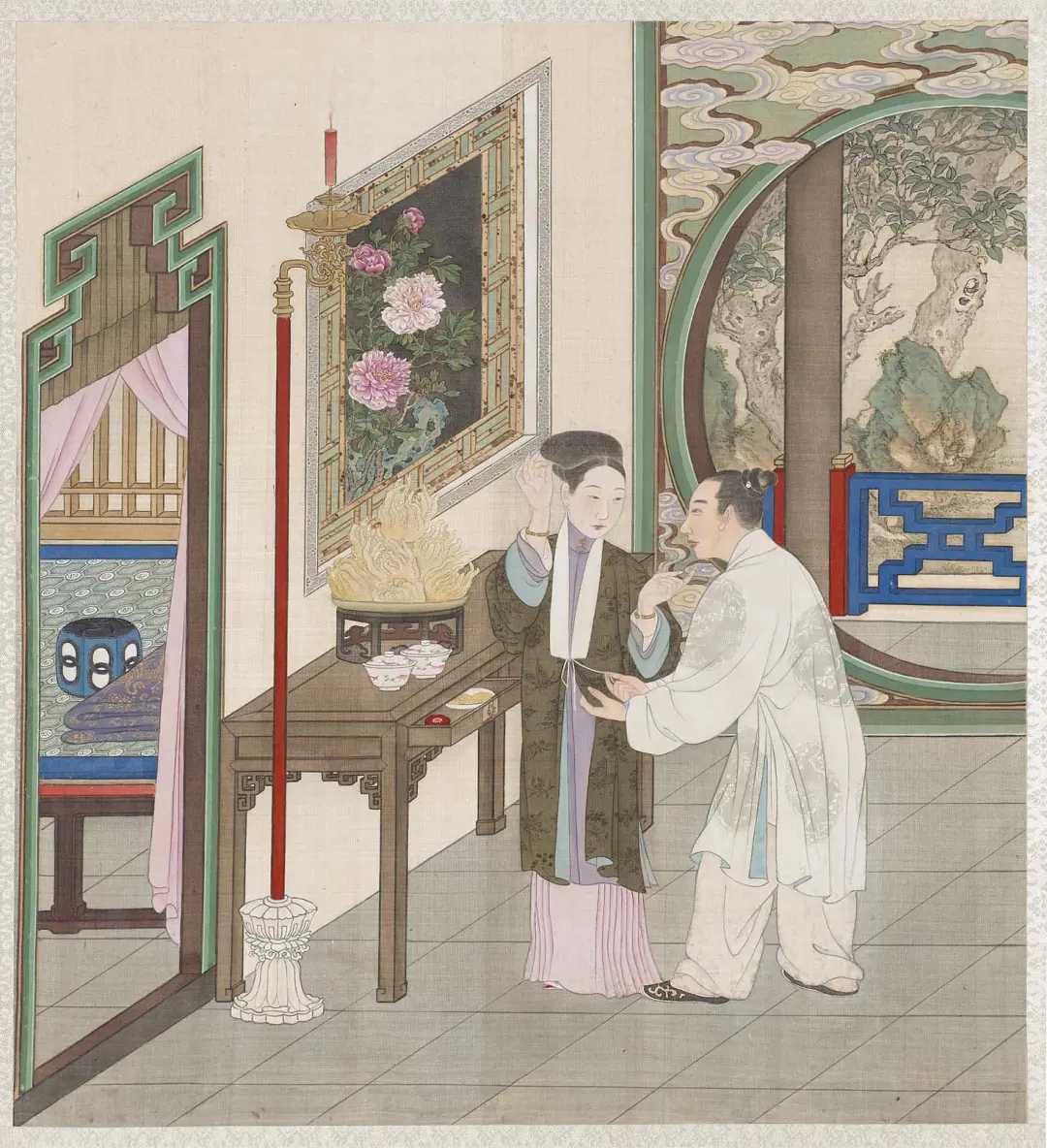 图册描绘清代亲王级别的家居生活场景,用笔精细,对人物服饰、神情及室内外陈设刻画入微。该图册后流散,其中十二开藏于美国波士顿美术博物馆,另外十二开曾由无锡秦家收藏。秦家后裔秦文锦于1904年创建的艺苑真赏社曾将其影印出版。该图册可用于研究明清生活习俗、服饰、家具。新城事遇见艺术