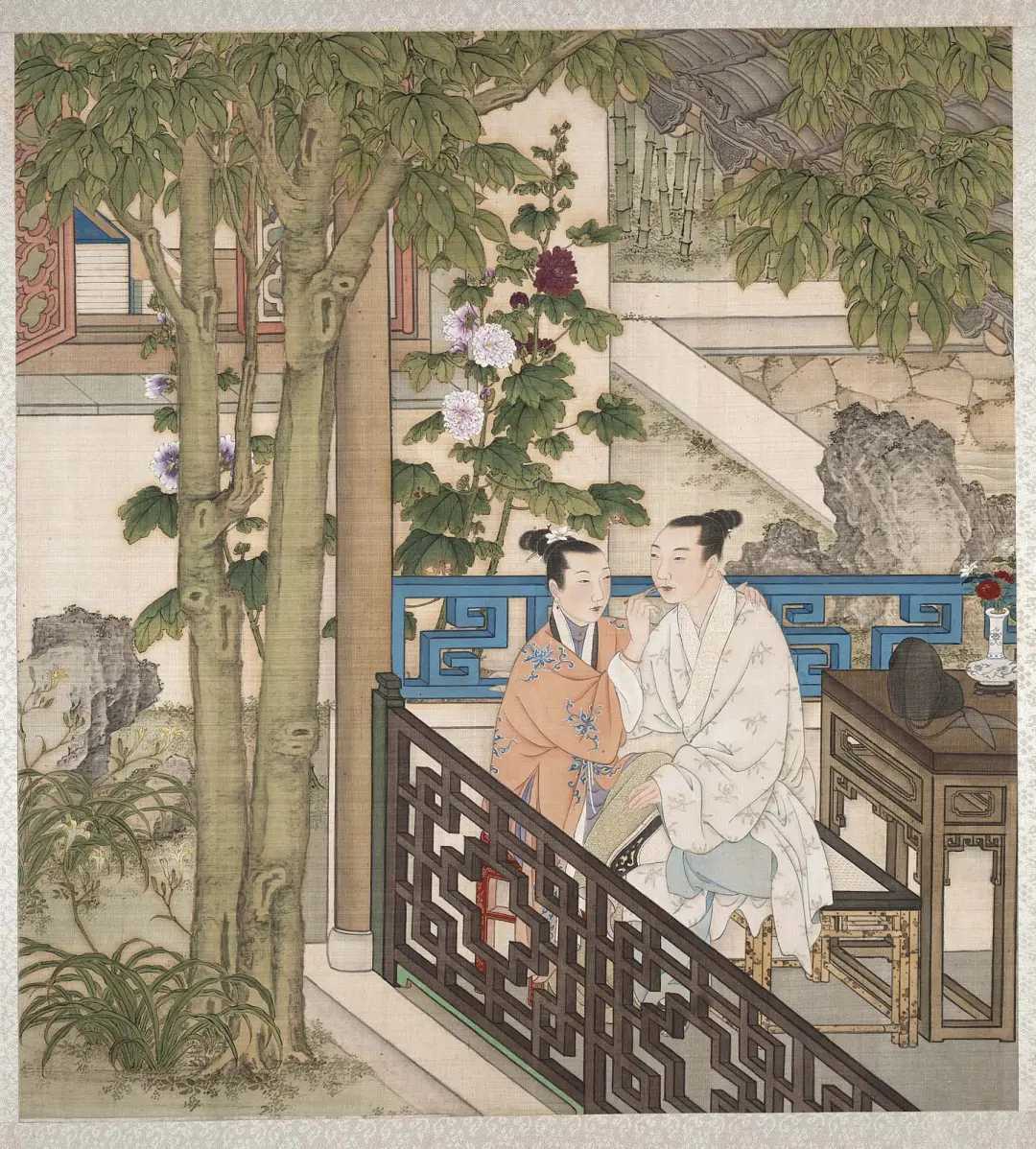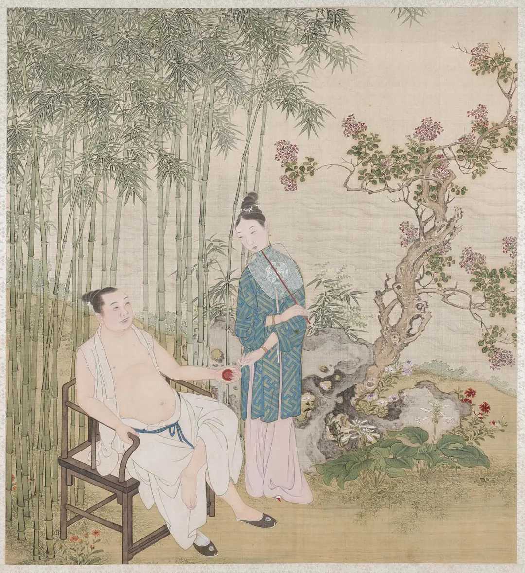 清 佚名《燕寝怡情图》。原为清宫内府收藏的珍品。全册原为十二开,共二十四幅图,分为上、下两册,上册扉页有“乾隆御览之宝”、“嘉庆御览之宝”两印。