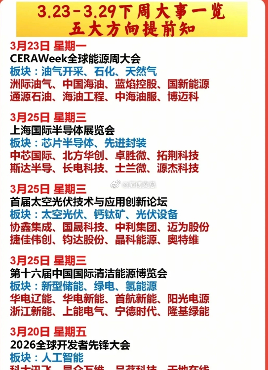 本周重点事件:CERAWeek能源周、半导体展、太空光伏论坛密集落地,把握事件驱动机会!以上内容仅作科普,不做任何投资依据,股市有风险,投资需谨慎。
