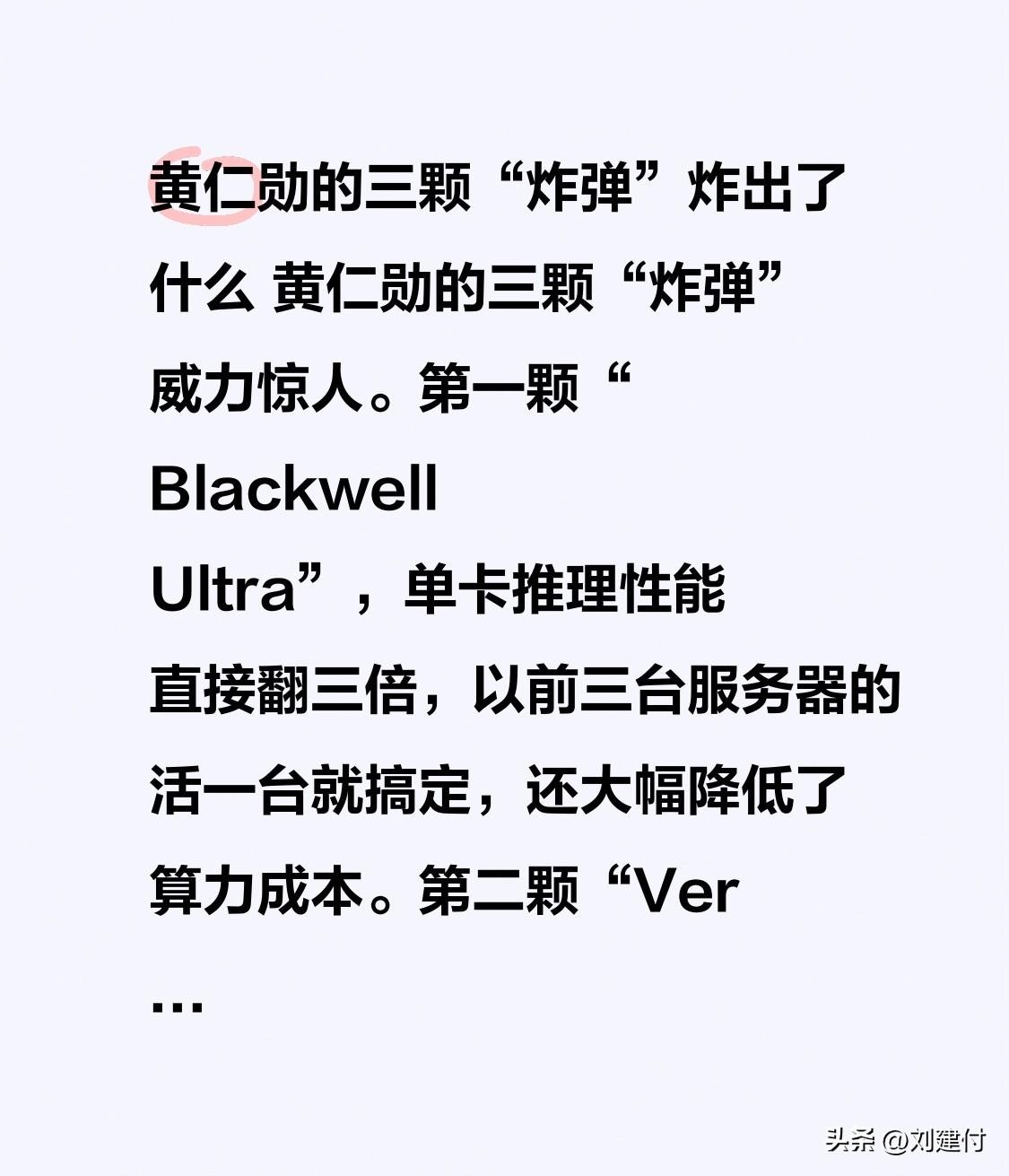 黄仁勋的三颗“炸弹”炸出了什么 黄仁勋的三颗“炸弹”炸出了什么 黄仁勋的三颗“炸弹”威力惊人。第一颗“Blackwell Ultra”,单卡推理性能提升至原来的三倍,原本需三台服务器完成的工作,如今一台就能搞定,还大幅降低了算力成本。第二颗“Vera Rubin”,提前亮出2026年的底牌,构建“内存共享池”,让运行万亿参数大模型无需再为显存问题担忧。第三颗“Feynman”更是核弹级别。 此外,他宣布英伟达布局轨道AI数据中心,Vera Rubin Space - 1模块性能比H100 GPU高出25倍,解决了低延迟计算、能源和地理政治边界等问题。另外推出的NemoClaw为企业级AI智能体提供“安全笼子”。这一系列举措改写了计算规则,科技界将迎来重大变革。
