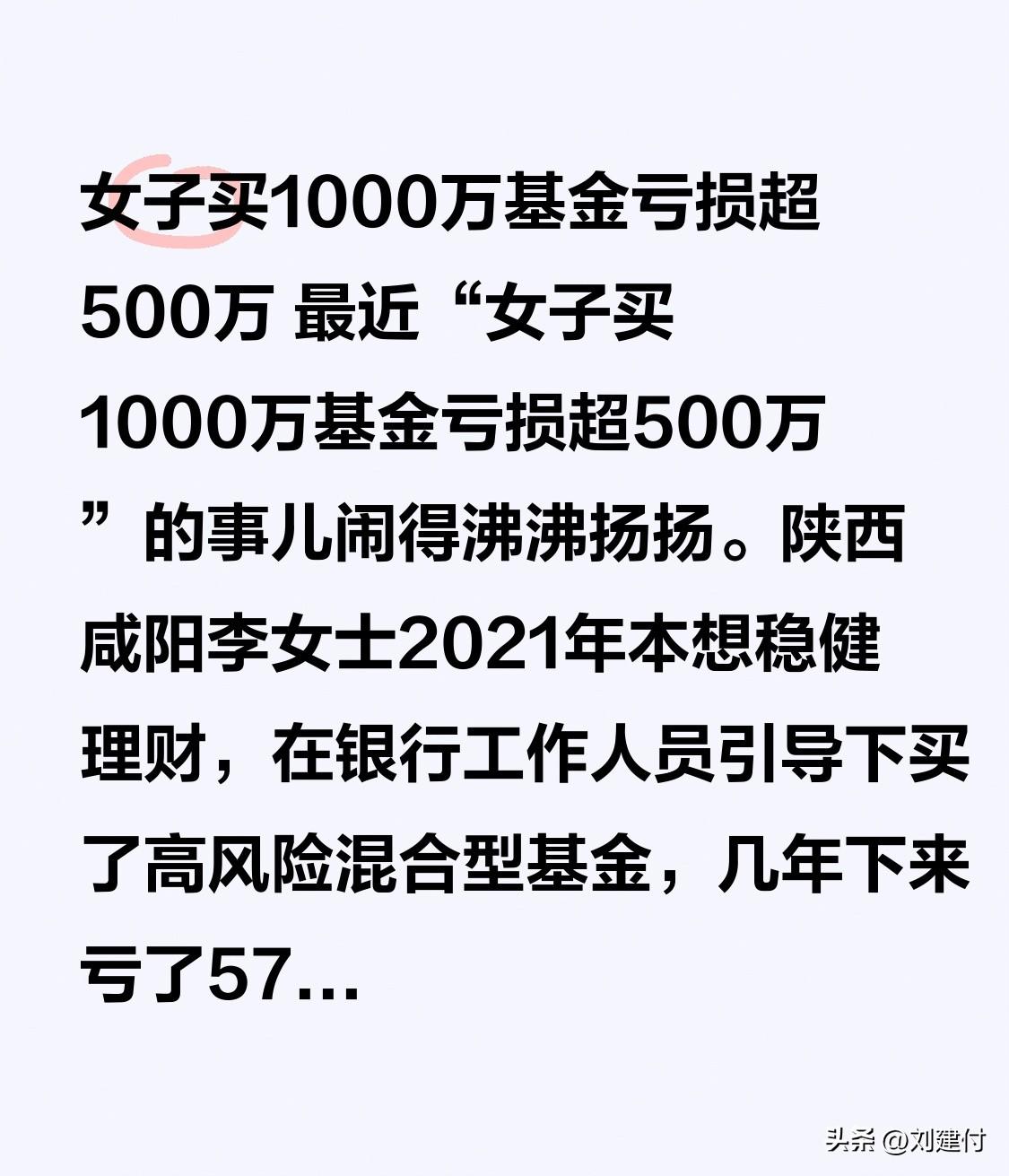女子买1000万基金亏损超500万 女子买1000万基金亏损超500万,此事近期闹得沸沸扬扬。2021年,陕西咸阳的李女士本想稳健理财,在银行工作人员引导下购买了高风险混合型基金。几年过去,她亏损579万,1000万仅余420万。李女士起诉银行未履行风险告知义务、诱导销售,一审被驳回,目前已上诉。 银行称购买流程有签字确认,风险提示完整,属自主投资。但李女士表示,工作人员以保本稳赚为由劝说,未充分提示风险,锁定期到了还劝她别赎回,致使亏损扩大。此事暴露出理财市场销售适当性缺失问题,投资真得谨慎!
