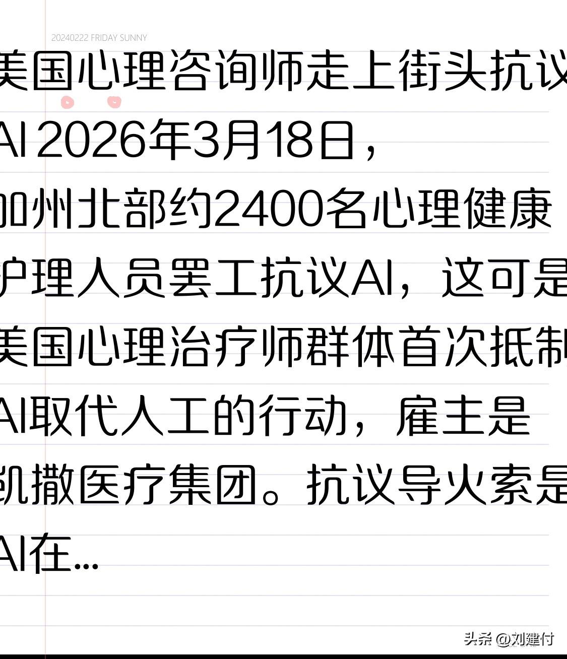 美国心理咨询师走上街头抗议AI 2026年3月18日,加州北部约2400名心理健康护理人员罢工抗议AI,这可是美国心理治疗师群体首次抵制AI取代人工的行动,雇主是凯撒医疗集团。 抗议导火索是AI在医疗领域快速渗透,2025年美国医疗机构AI采用率飙升到22%,一年内还冒出8家AI医疗独角兽。凯撒集团大规模铺开AI病历系统,导致就业受冲击,2026年2月美国医疗行业岗位减少,教育医疗行业单月就少了3.4万人。而且全美约42%的岗位有被AI替代风险。 心理咨询师的担忧不无道理,多项研究显示AI在心理健康服务有严重短板,它真能胜任复杂的人性工作吗?