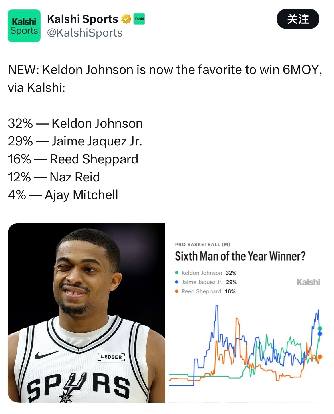 年度最佳第六人预测📊马刺球员凯尔登-约翰逊32%的概率升至第一超话创作官 |圣