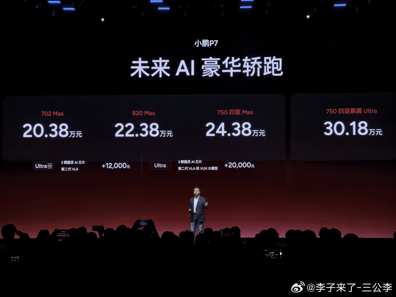 3月18日,小鹏在广州以“爱P7的鹏友大聚会”形式举办发布会,主打车主互动,推出新款小鹏P7。新车核心搭载第二代VLA智驾系统,具备L4初阶能力,感知与决策更智能。外观新增星曜红、暗夜黑、星云白3款车色,车色总数达10款,内饰与轮毂同步优化。新车新增Max、Ultra SE两个版本,售价20.38万-30.18万元,涵盖不同续航与四驱版本,配置、操控全面升级。何小鹏公布第二代VLA推送时间表,3月19日起分批推送,P7、G7、X9等车型月底前完成更新。本次发布会以用户为中心,强化智能与颜值,巩固P7在纯电轿跑市场竞争力。