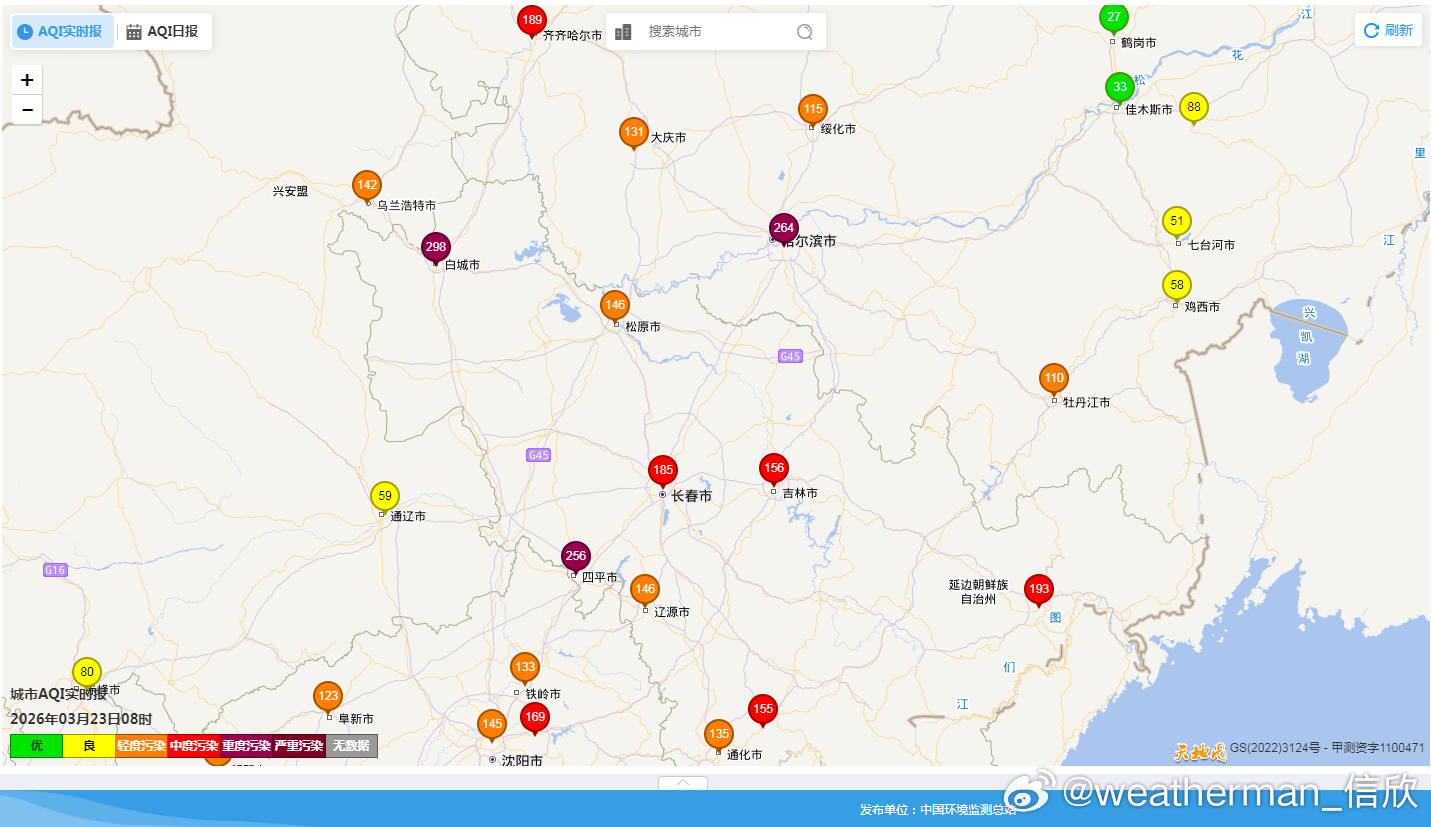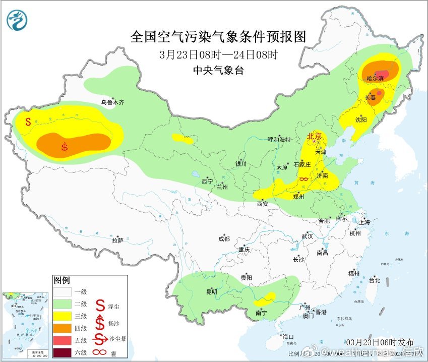 从今晨空气质量看,东北、华北、黄淮、江淮多地存在污染,其中哈尔滨、白城、四平出现了重污染,对应有霾。西北部分地区存在轻度的沙尘污染,首要污染物为PM10。今后3天,近地面的高压向东南推进,华北黄淮一带处于高压后侧,偏东风或偏南风影响下,偏东沿海的空气质量好转,但内陆靠近太行山一侧,可能还有些污染持续。东北在小南风里,霾也可能持续。此外新疆塔里木盆地还有沙尘。