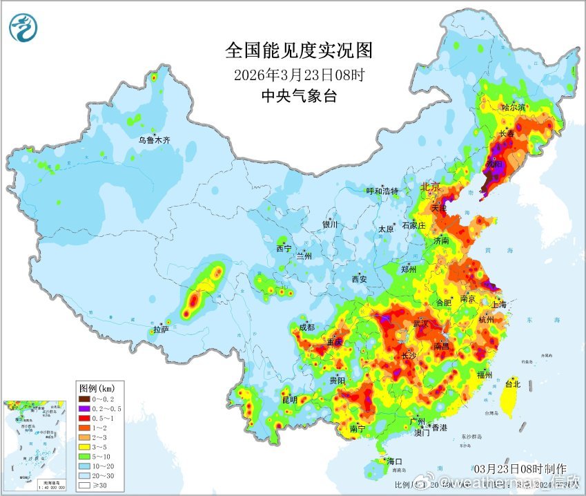 【雾 霾 沙尘】今晨我国多地能见度差,在吉林辽宁河北天津等地雾霾混杂,江苏、江西、湖南、广西、贵州、云南部分地区出现大雾,浙江福建部分地区雨雾蒙蒙。部分省份8时能见度最低站点:湖南南岳37米、辽宁营口46米,均为特强浓雾;广西南丹67米、云南西盟68米、贵州开阳78米、重庆万源84米、江西定南88米、福建周宁88米、浙江青田93米。