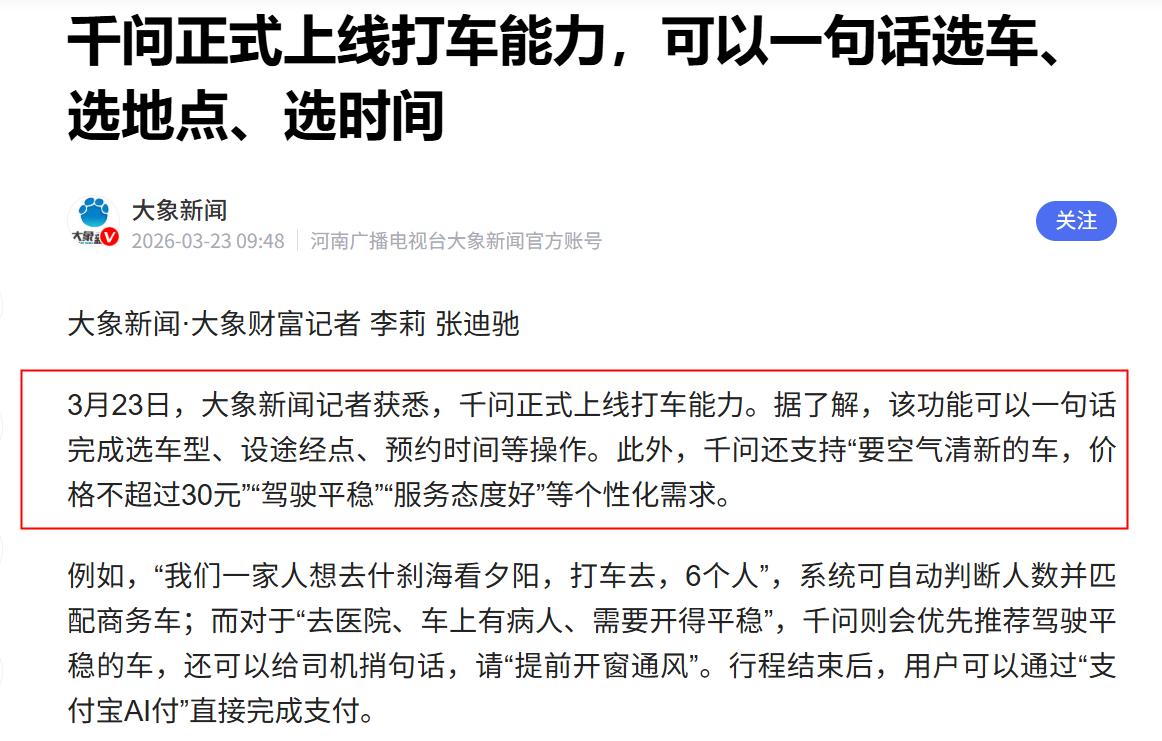 今天和朋友谈起千问上线AI打车的消息,他的两个观点让我非常意外! 最近,新闻报道称,千问上线AI打车功能,这是继千问点外卖、买电影票之后,在办事领域的又一次突破。 对于这个消息,朋友提出了有意思的看法,它认为千问AI打车的出现,代表了两个重要的信号: 第一,中国AI领先全球,已经率先一步进入“办事时代”了。为什么这么说呢?因为打车其实是一个复杂的过程,有着高频、低容错、强履约的特点。 正是因为这样,国外在AI打车上一直迟迟无法前进。Gemini虽然已经能够通过语音叫车,但是主要还是通过操作打车App的方式完成任务,本质上只是在AI里接入了一个打车App的端口。 但是千问不一样,它只需要用户一句话说出复杂需求,AI就会真正去理解人们的意图,然后调动AI完成打车。 因此,在这一点上,中国已经走在了前面。 第二,这是AI技术从互联网走向实际生活的重要一步。以前AI更多的停留在聊天,解答问题上。但是现在不一样,AI成了每个人现实生活场景中都可以用的样子,在真正的帮我们打车办事了。 换句话说,现在的AI技术不再那么遥远,而是真的融入到了每一个人的生活中,开始帮我们“干活”了。 当然,这一切的背后,最根本原因还是因为具备着强大的大模型技术以及丰富的生态,如果没有这两点,阿里怕是也很难抢先全球一步! 人民日报说,千问打车让AI解决真问题,这话说的真没错!