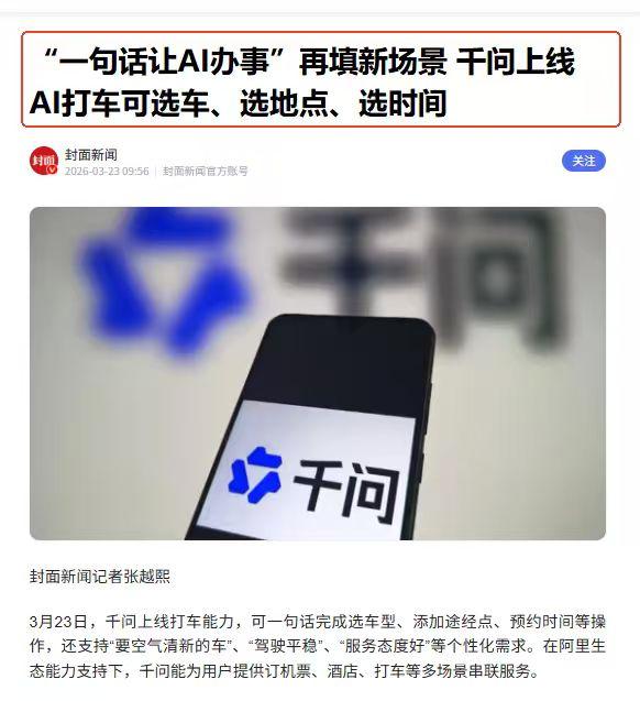 “千问帮我打车回家”火了,老外傻眼! 在全球AI竞争进入应用落地的下半场,本来准备大干一场的美国科技公司却被接连失利,反观以阿里为代表的中国企业在AI办事领域接连突破。 最近继AI点外卖、订酒店、订机票之后,阿里AI办事能力更进一步。千问上线了AI打车能力,用AI打车,你会有什么不同的体验呢? 举个例子,你急着去办事情,必须找一辆能尽快找到一辆送到目的地的车,又想要便宜点的车型。搁以前要先定位,然后勾选符合你预算的车型,然后让系统匹配车型,在等车过来,其实操作挺繁琐的。 但是在千问,只需要说“我要去最近的民政局,要空气清新的车,司机驾驶平稳一点。”,千问就能清晰理解你的需求,并帮你完成车型匹配、调度车辆等一系列操作,它就好比一个贴身秘书,你只管吩咐它。 这里必须要说的是,谷歌、OpenAI也在尝试实现AI打车,可是只能做到将打车平台唤起的程程度,仅是换了一个端口而已,用户仍需要进行各种操作。 不只是打车,这些美国科技公司在购物等其他AI办事能力上同样进展缓慢。前段时间,美国知名科技商业媒体The Information就发出警告称,阿里巴巴在AI办事领域的进展快于亚马逊和OpenAI。 不仅如此,外媒还大有深意地评价道,“这将又是一个中国科技企业从美国科技公司接过接力棒并加速奔跑的例子,这种情况已多次发生。” 事实上,不管是一句话购物,还是一句话打车,这里面存在诸多挑战。只不过千问除了有强大的模型能力支撑,还有阿里覆盖衣食住行的完善生态以及强履约能力。 显然,中国不仅在模型层面实现了快速追赶,在AI办事领域更是取得了先发优势。