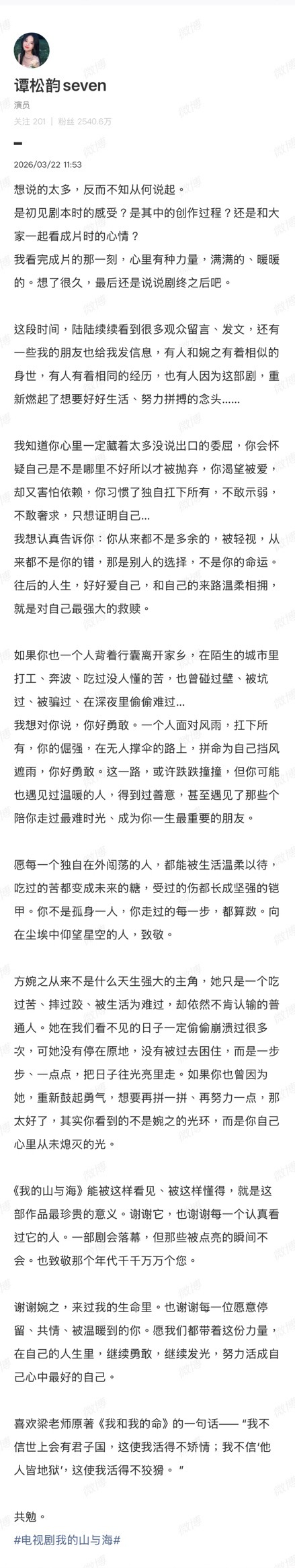 作为粉丝,我真的很骄傲。她一直在认真拍戏,也一直在认真做人。谭松韵长文告别我的山与海 谭松韵