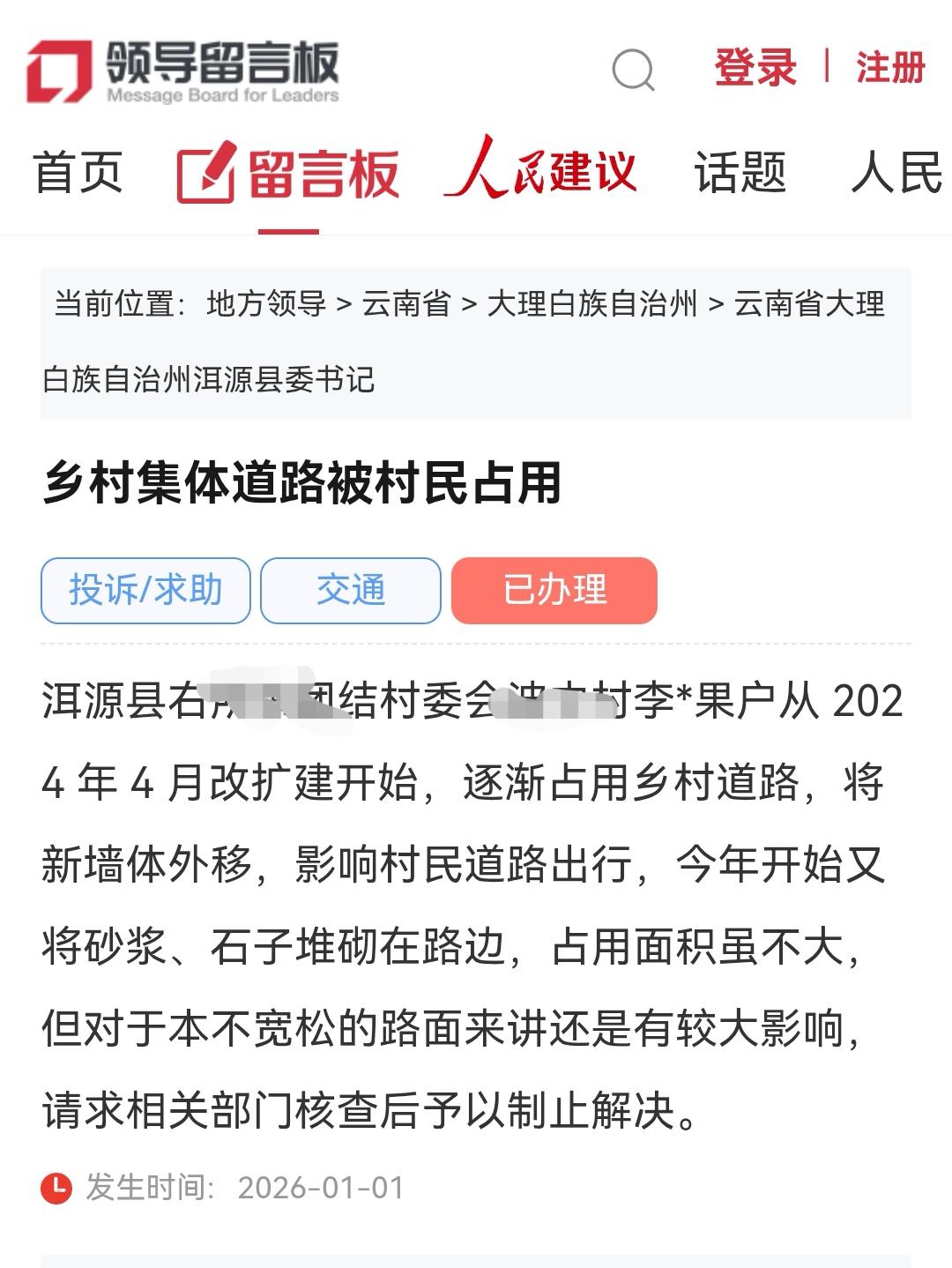 大理洱源网民反映乡村集体道路被村民占用影响较大 近日大理网民通过人民网领导留言板给洱源县委书记留言: ✍➡️📨乡村集体道路被村民占用 洱源县右所镇X村委会X村李*果户从 2024 年 4 月改扩建开始,逐渐占用乡村道路,将新墙体外移,影响村民道路出行,今年开始又将砂浆、石子堆砌在路边,占用面积虽不大,但对于本不宽松的路面来讲还是有较大影响,请求相关部门核查后予以制止解决。 ⏱发生时间: 2026-01-01 📢📢📢2026-01-26 19:01 洱源县右所镇人民政府官员回复 网民同志: 您好!您通过人民网“领导留言板”给县委书记的留言已收悉。我镇已正式受理,并按照《信访工作条例》规定进行了认真调查。现对您所反映的问题答复如下: 一、您所反映的诉求 您反映:“洱源县右所镇团结村委会波中村李某果户从2024年4月改扩建开始,逐渐占用乡村道路,将新墙体外移,影响村民道路出行,今年开始又将砂浆、石子堆砌在路边,占用面积虽不大,但对于本不宽松的路面来讲还是有较大影响,请求相关部门核查后予以制止解决。” 二、调查核实情况 接到信访件后,镇党委政府高度重视,立即组织分管领导及相关部门工作人员前往现场进行调查核实。经调查核实,您反映的李某果户在村内道路边堆放砂石,影响村民正常通行的情况属实。 三、处理意见 根据李某果户占用道路违规堆放砂石情况,右所镇综合行政执法队于2026年1月8日对该户进行教育批评,并责令其移除违规堆放的砂石,目前该路段违规堆放的砂石已移除。为方便群众的正常生产生活,构建美丽村庄,下一步我镇将加大巡查力度,对“十乱五堆”现象严格查处,同时加强宣传力度,从源头杜绝“十乱五堆”现象。 感谢您对右所镇人民政府工作的理解和支持!