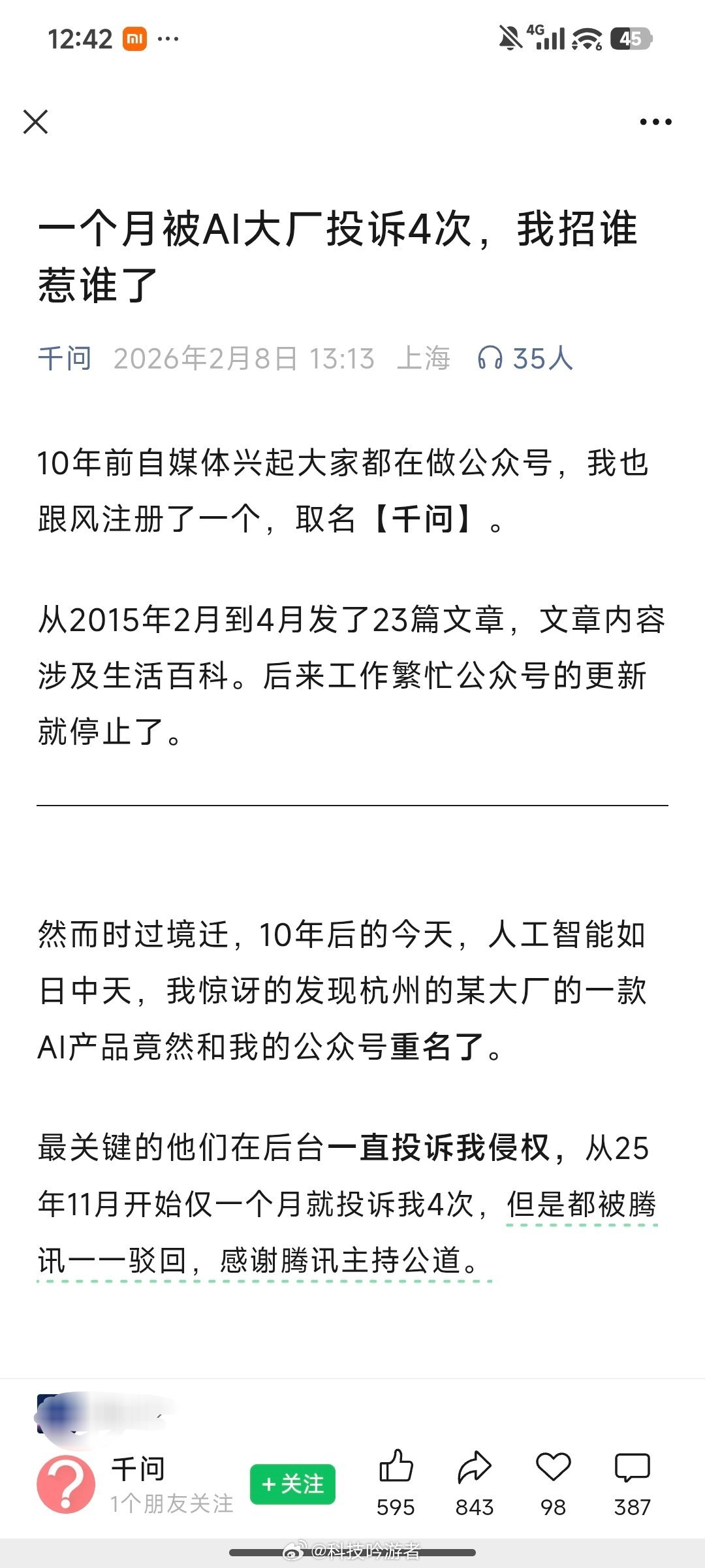 有个公众号叫“千问”,十年前注册的,现在被阿里千问疯狂投诉… 网友调侃:幸好你不