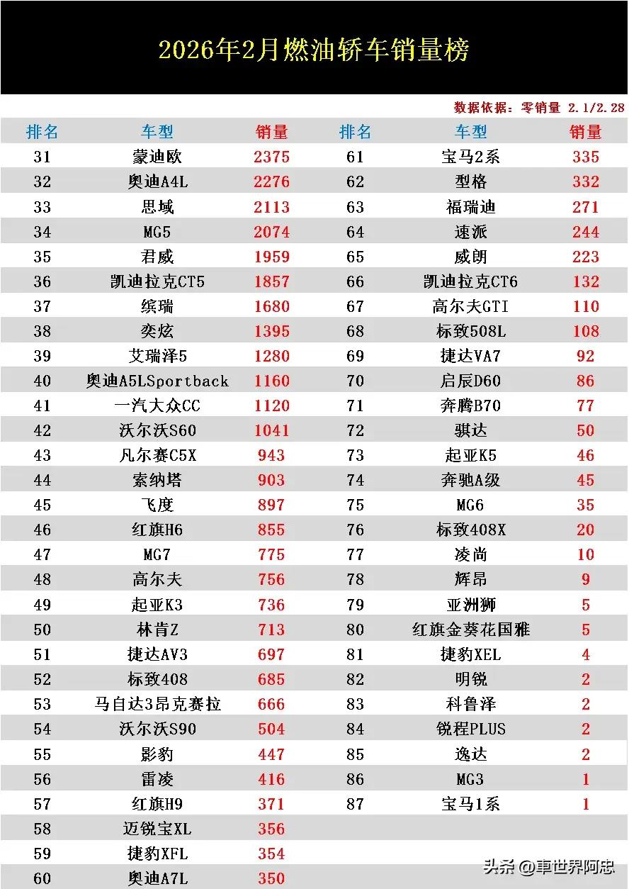 2026年2月燃油轿车销量排行榜已经正式公布了!快来看看你的爱车排在第几名? 根据榜单数据显示!2月份共有9款车型销量突破万辆大关,其中大众旗下三款车型拿下榜单前三名,前十占4,而国产车同样不甘示弱,也有4款车型进入榜单前十名,日系整体表现不佳,只有凯美瑞一款车型抗日日系大旗。 第一名朗逸销量16111辆,第二名帕萨特销量13988辆,第三名速腾销量13803辆,第四第五名被国产车包揽,其中星瑞销量12411辆,艾瑞泽8销量12130辆。看完销量排行榜你的爱车排在第几名呢?