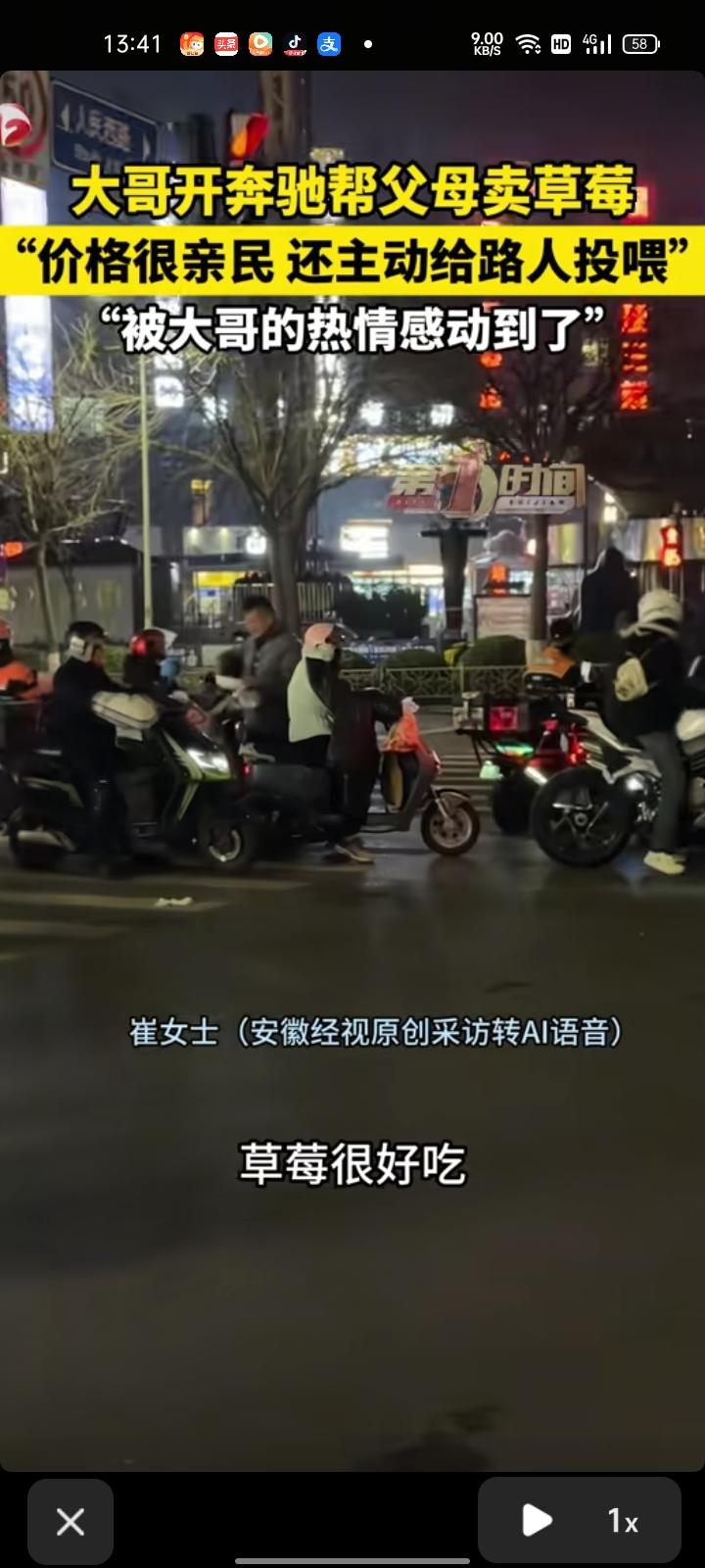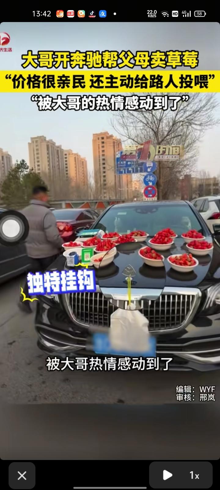 3月22日,山东淄博。女子分享一段视频,在路上偶遇一位大哥开着奔驰帮父母卖草莓,