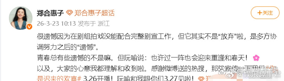 郑合惠子称剧宣不是放弃是遗憾郑合惠子回应:“很遗憾因为在剧组拍戏没能配合完整剧宣工作”,但她表示这不是放弃,而是多方协调努力之后的“遗憾”。