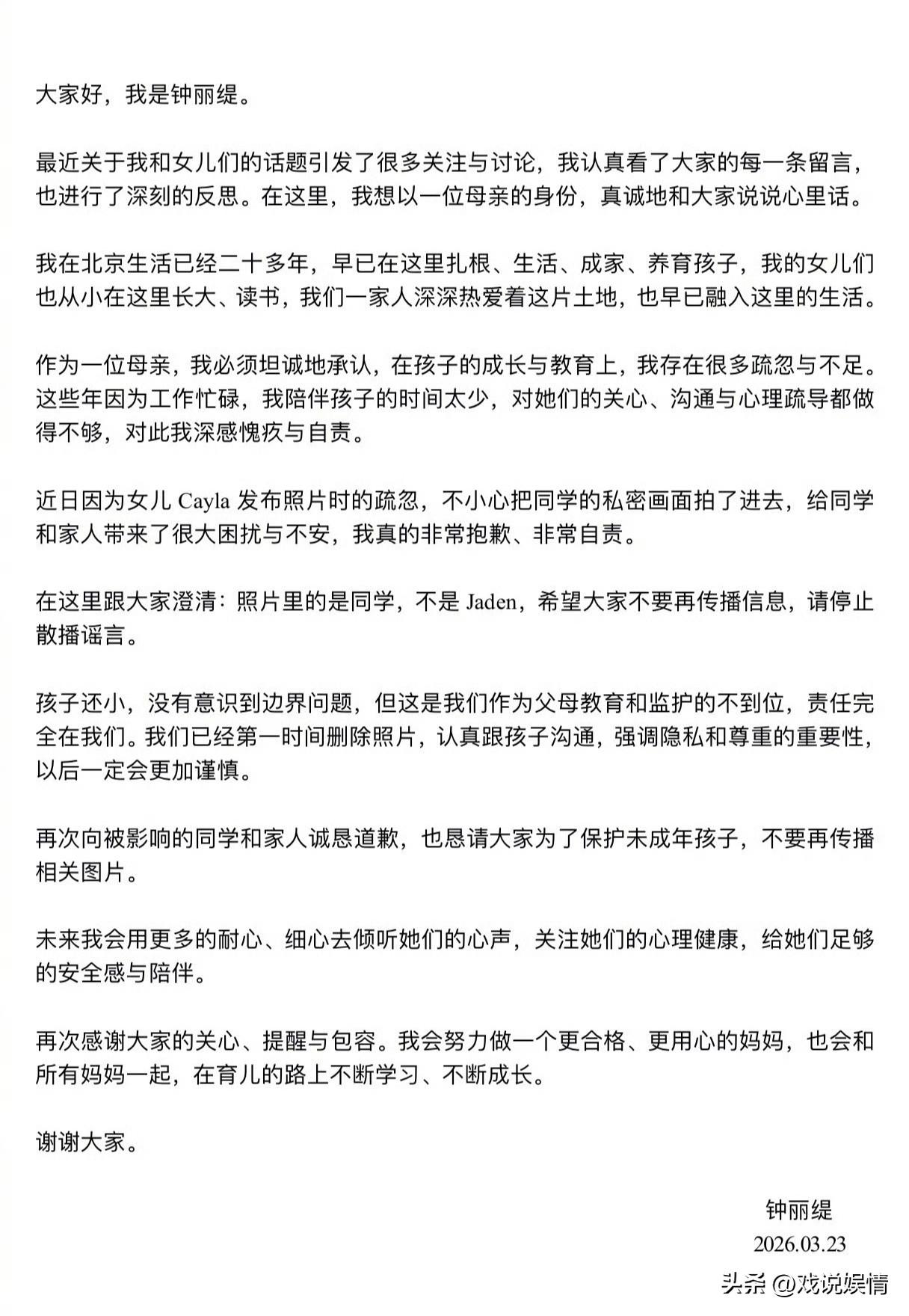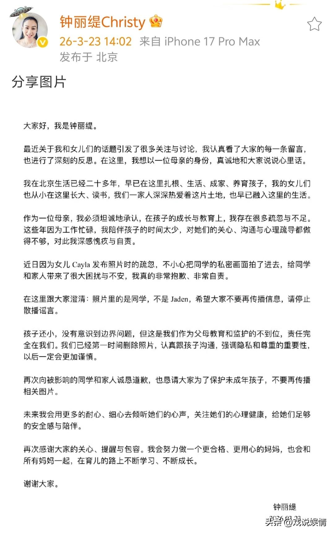 钟丽缇替女儿考拉道歉! 3月23日,钟丽缇发文代替小女儿考拉向同学道歉了! 钟丽缇称考拉发布的照片中,背景里坐在马桶上的女孩不是姐姐Jaden,而是同学。钟丽缇向被影响的同学和家人道歉,也反省了自己作为母亲的不足之处。她承担起全部责任,坦承在女儿的成长和教育上存在很多疏忽与不足,称已经删除照片并跟孩子强调隐私和尊重的重要性。 可以说钟丽缇是一位很棒的妈妈了!女儿的事情她完全没有逃避责任,且试图将舆论的战火引到自己身上,以自身对女儿的疏于管教来平息舆论。钟丽缇确实很伟大,孩子确实还小,相信未来会更加谨言慎行的!