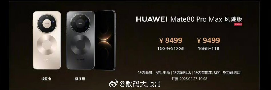 华为Mate 80 Pro Max风驰版,全系16GB大内存:16+512GB 售价8499元16+1TB 售价9499元主打高性能散热,定位旗舰游戏、重度使用机型。华为春季全场景新品发布会