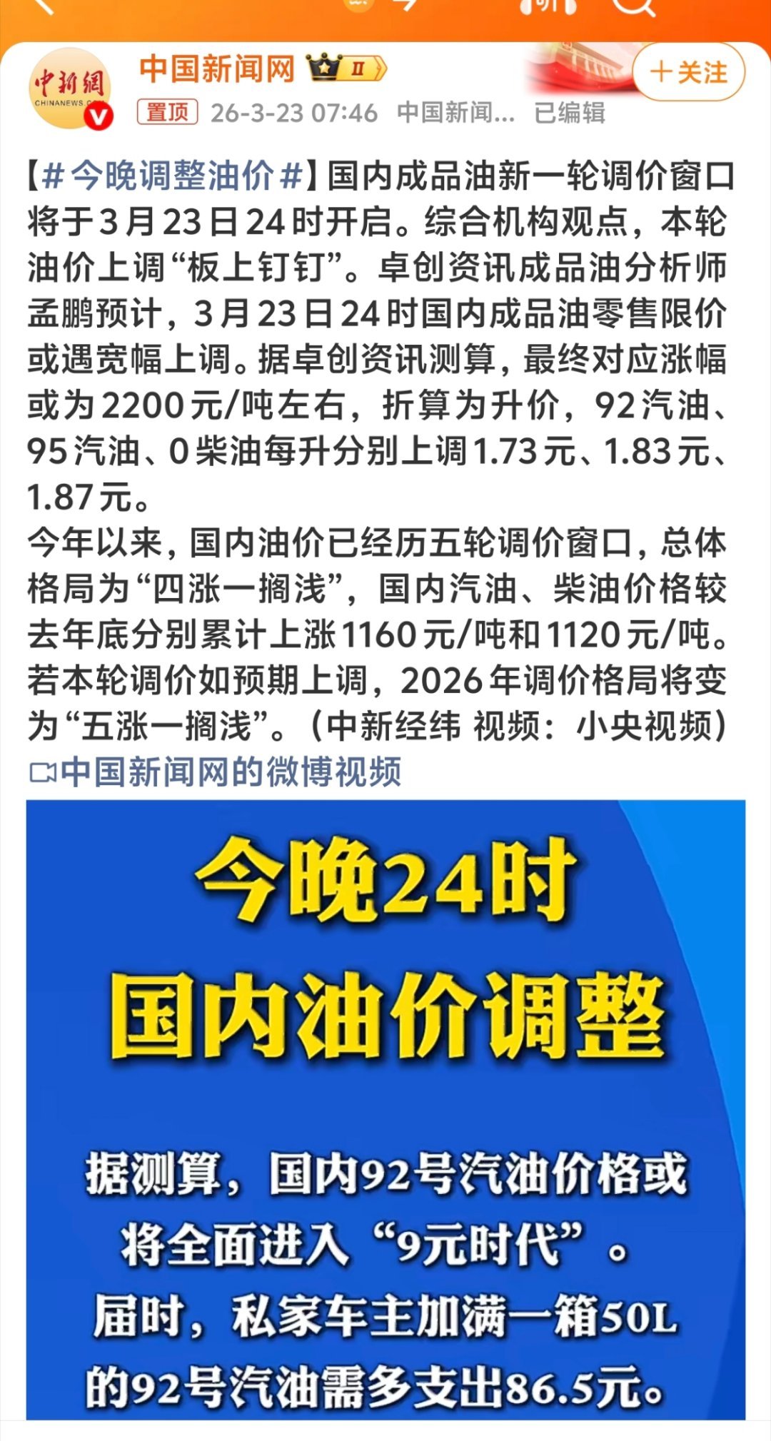 #今晚调整油价##对国内成品油价格采取临时调控# 刚刚到附近加油站给车加油,现场加油特别统一——都是92加满,95加满。 一个比一个大方,