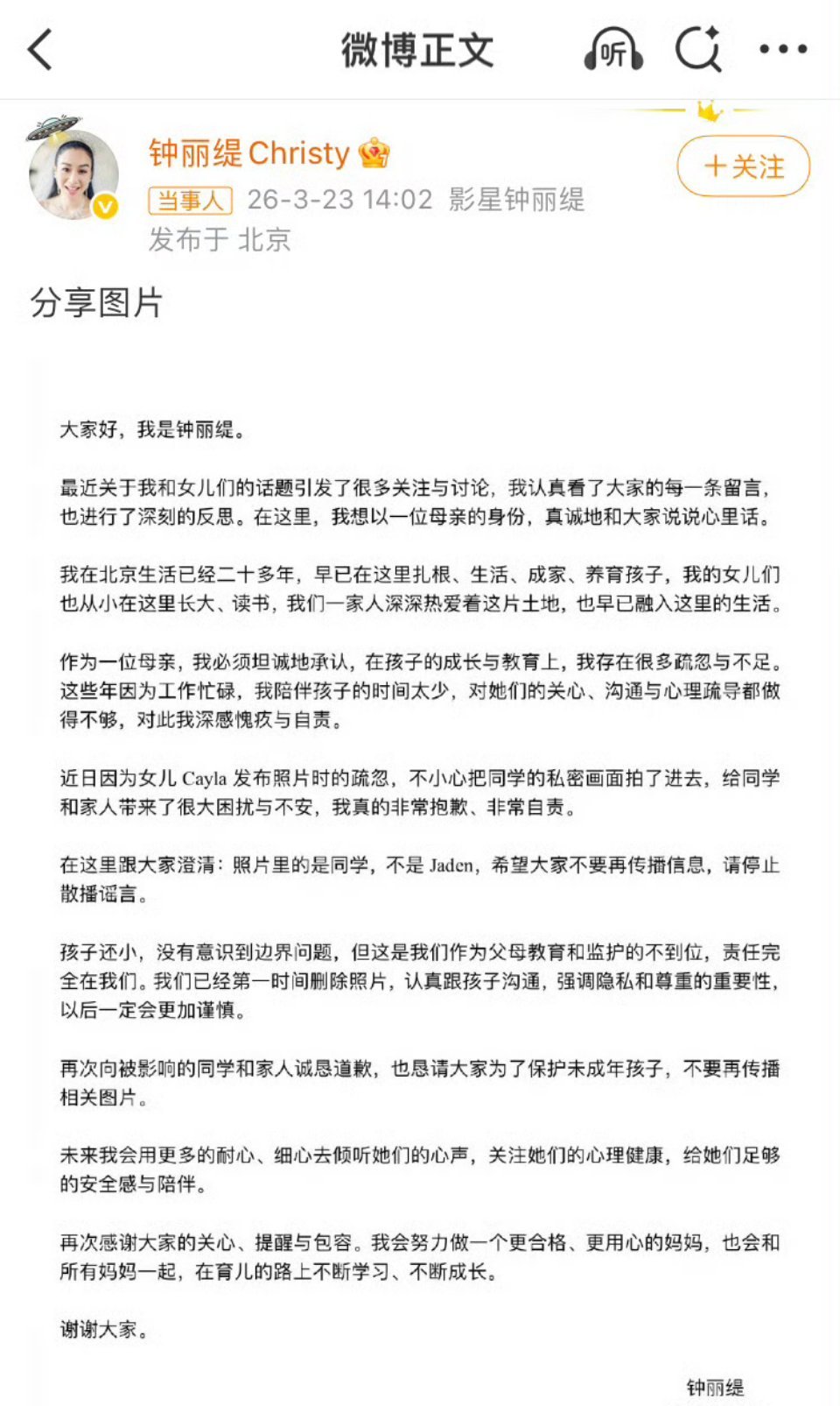 钟丽缇发文回应女儿争议公众人物没有这种意识吗?而且回应道歉总结下来就是“是同学不是Jaden”,多注意点孩子的教育吧....