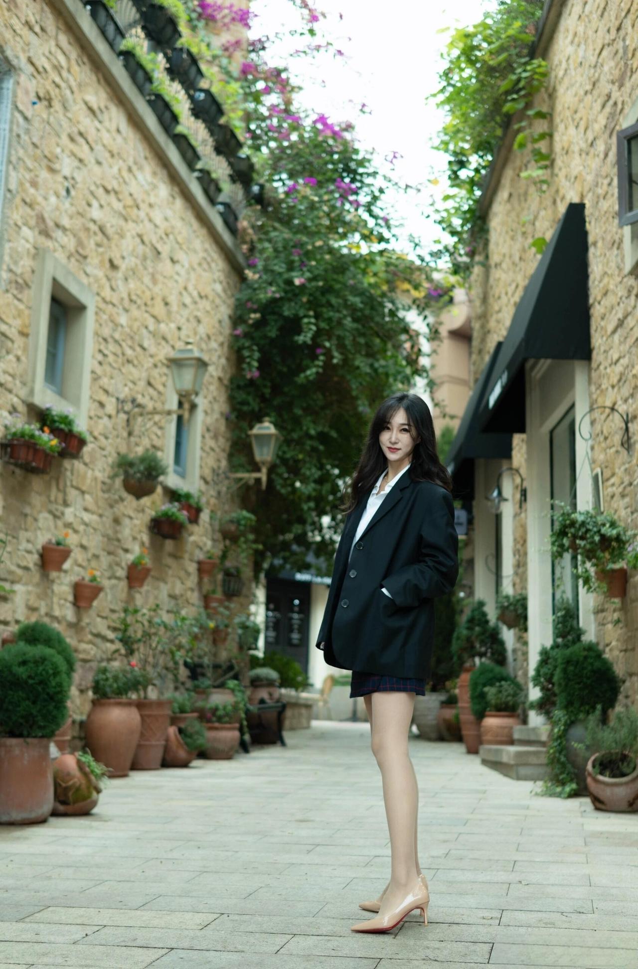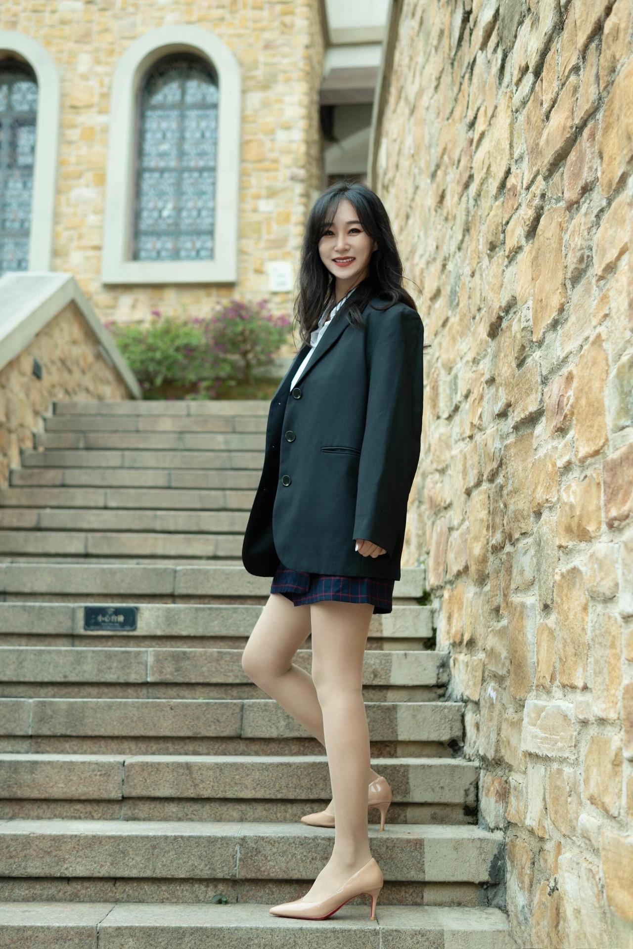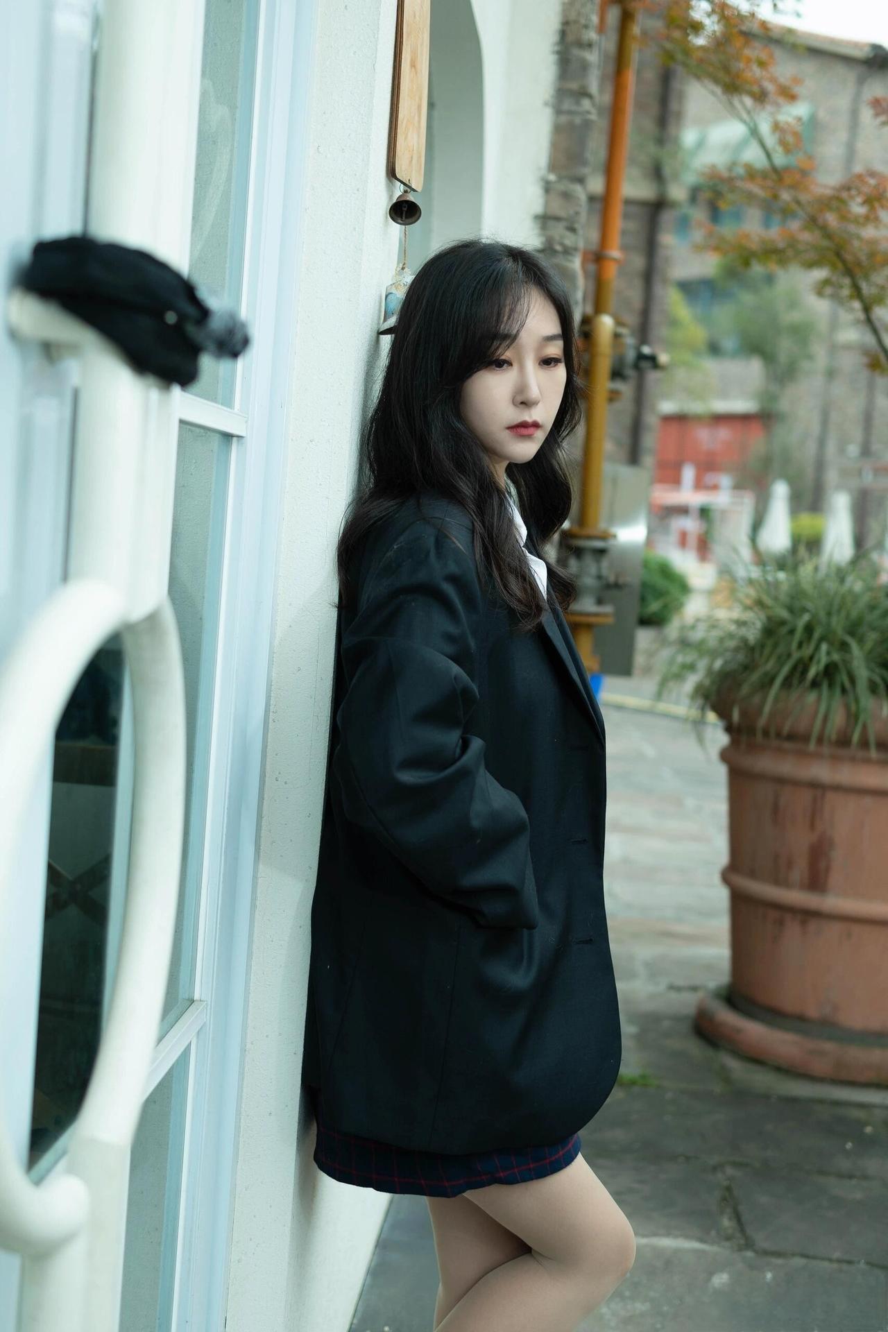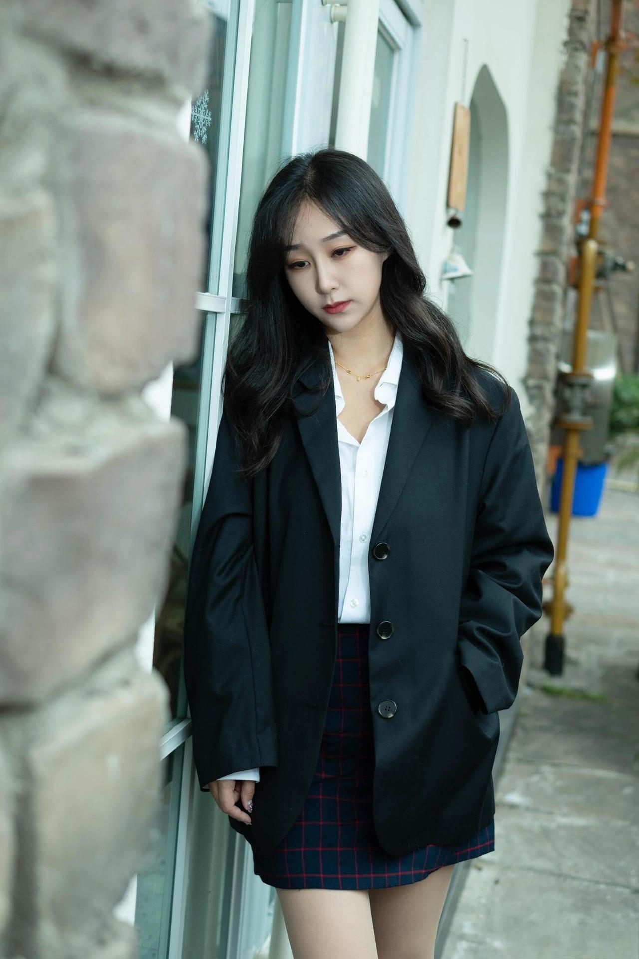 这套是学院风轻熟通勤风,核心是黑西装+格纹短裙的搭配:宽松西装自带松弛气场,格纹