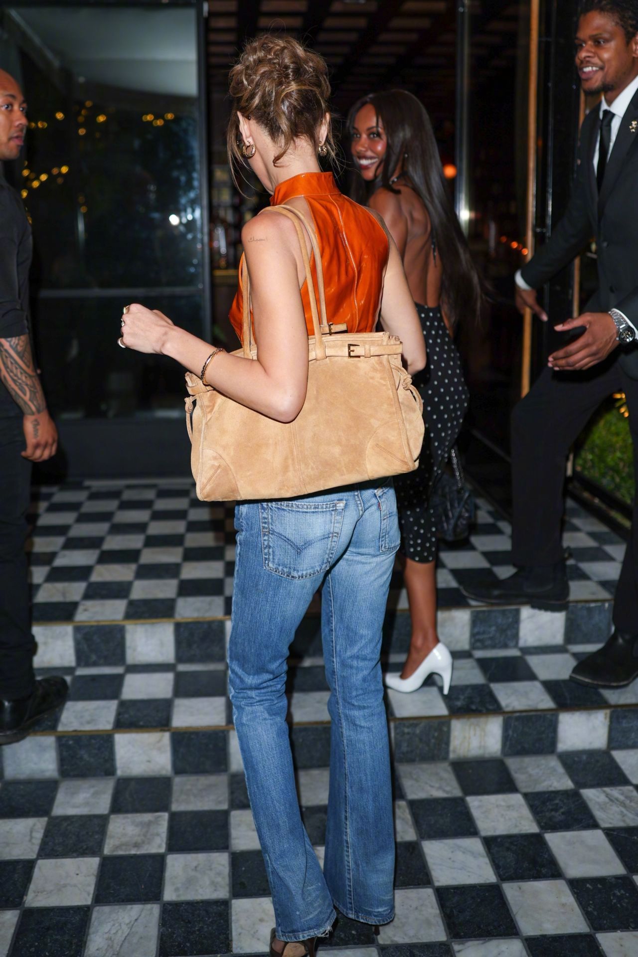 现身西好莱坞Bird Streets俱乐部的Bella hadid,又一身复古造型。无袖高领亮泽焦橙色收腰上衣,配搭牛仔裤和箭头皮鞋, 肩背Prada Bonnie 包包。米拉服饰解析